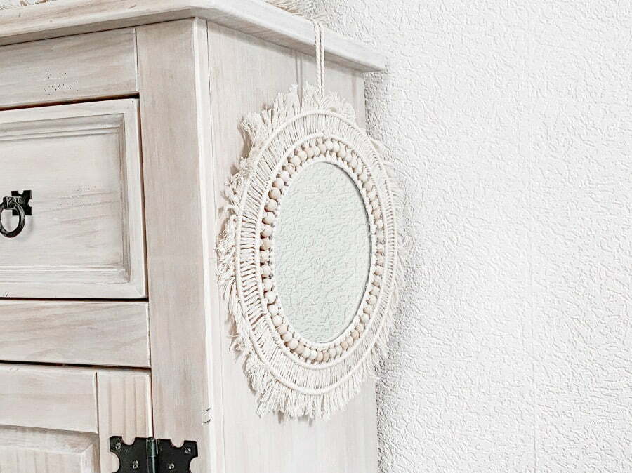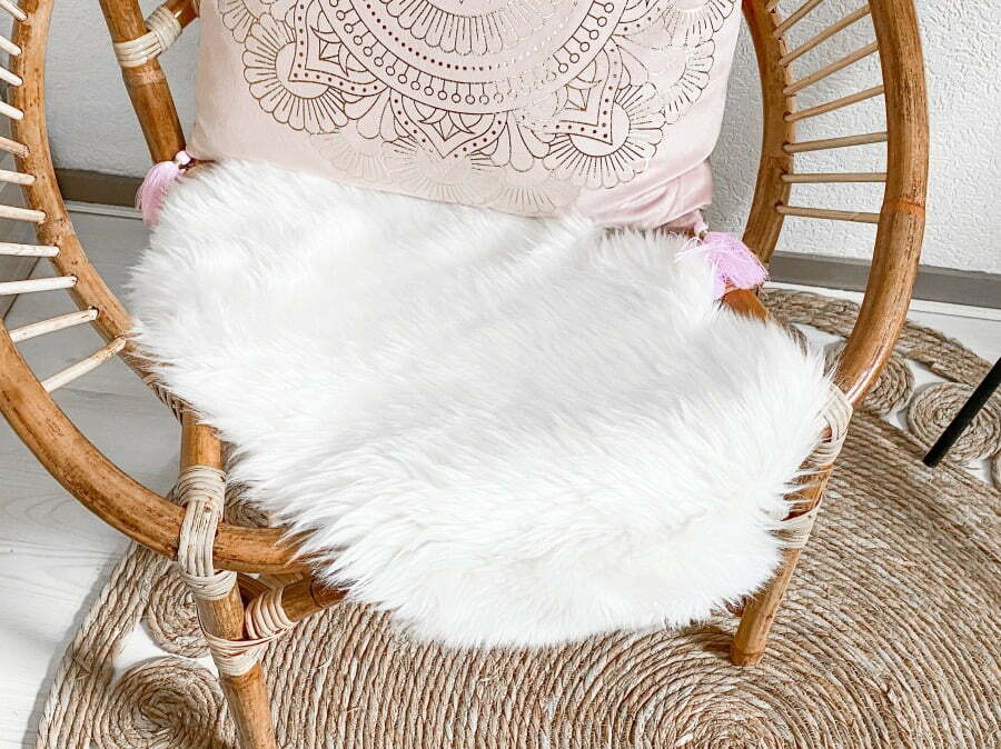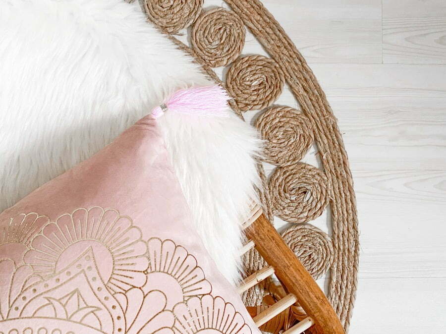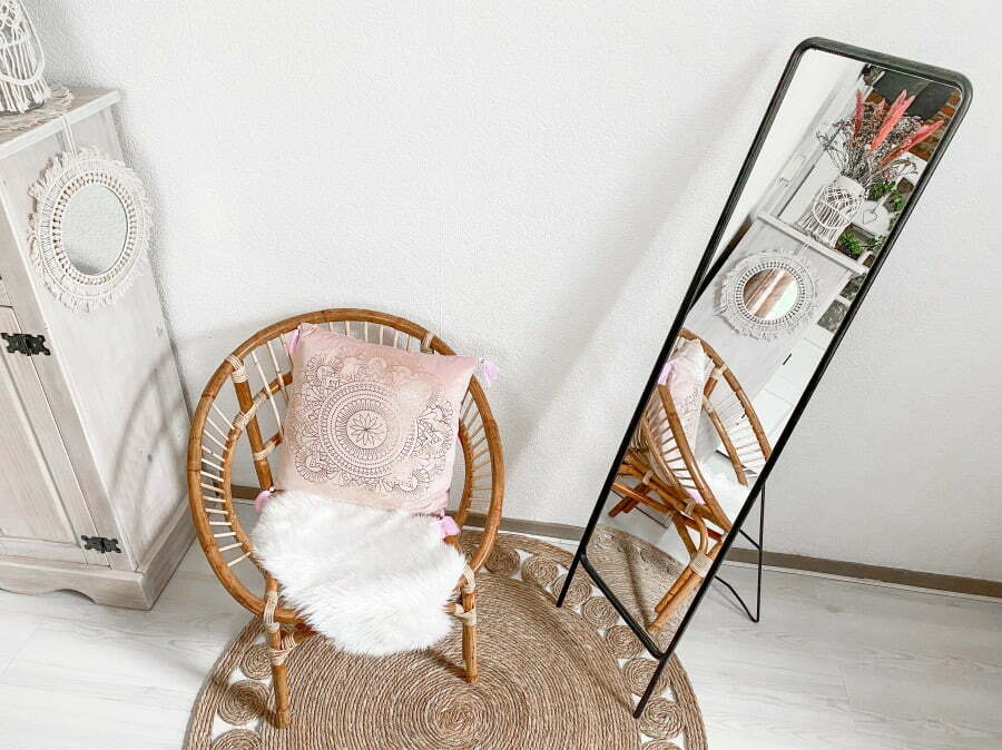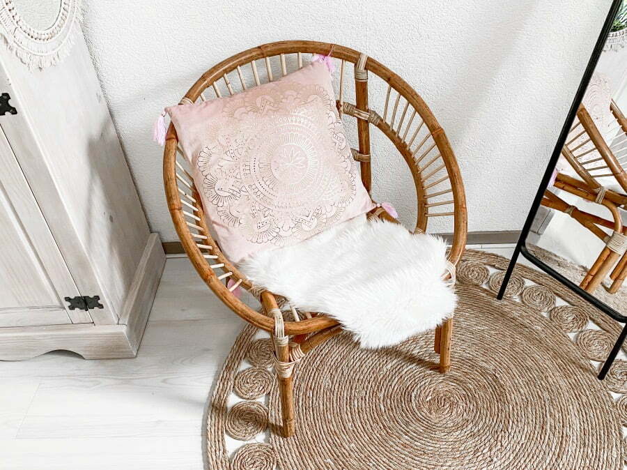 Naast de spiegels heb ik ervoor gekozen om het hoekje wat op te leuken met een prachtige rotan kuipstoel. Ik heb al een tijdje een zwak voor dit soort stoelen en als je hem leuk aankleed kun je er zoiets sfeervols van maken. Dit heb ik dan ook gedaan. Ik heb in de stoel een leuk wit kleedje gelegd van imitatie bont en een lief, licht roze kussentje met een mandala print en kwastjes, Dit ziet er toch gezellig uit zo? Ik ben helemaal verliefd.