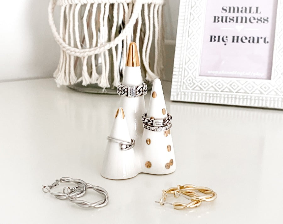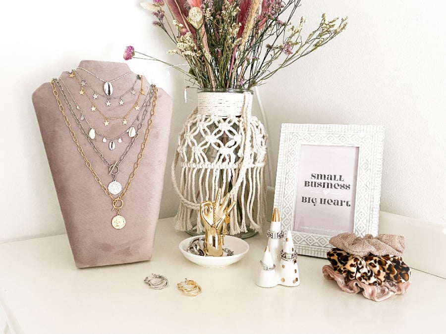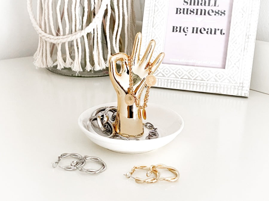 Iets wat ik nog miste in mijn kantoortje waren items om mijn sieraden op te presenteren. Ook daarvoor is Xenos the place to be! Ik vond er namelijk een prachtige display voor kettingen, een sieraden schoteltje en een ringhouder. Echt wat een mooie items. Hele fijne toevoegingen aan mijn heerlijke werkplekje. Hoe leuk staan deze 3 items ook bij elkaar? Hier kan ik oprecht zó gelukkig van worden.