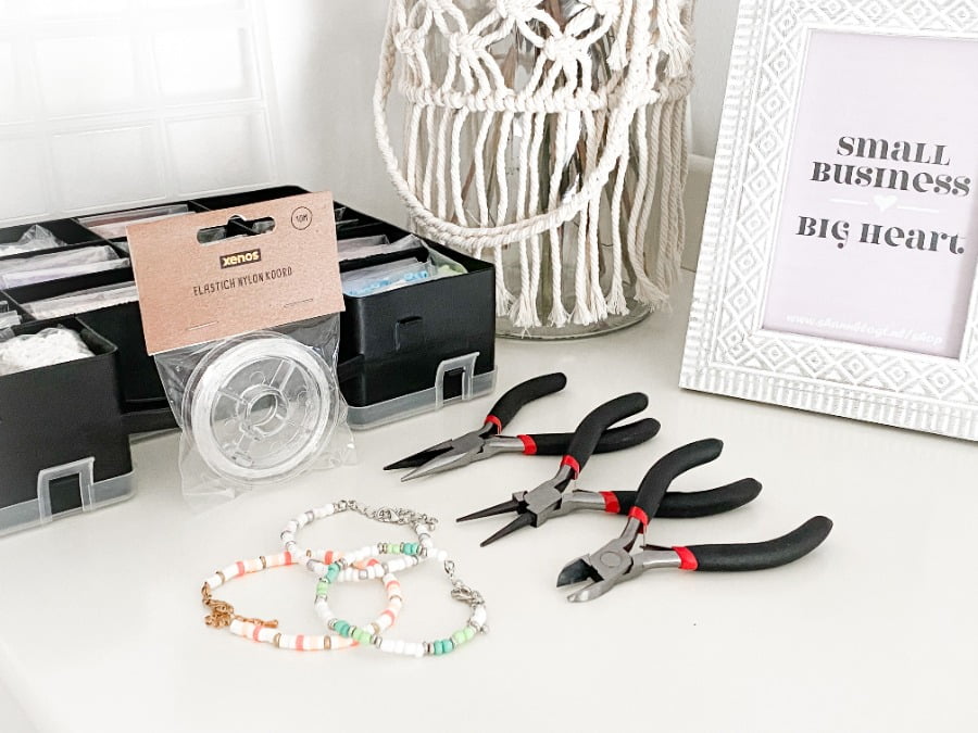 Producten die ik onder andere in mijn webshop verkoop zijn handgemaakte sieraden. Deze vind je in de categorie ‘Handmade with Love’ mocht je daar benieuwd naar zijn. Ik gebruikte daar altijd tangen voor die ik bij papa in de schuur vond. Echte sieradentangen zijn natuurlijk een stuk praktischer. Guess what? Deze vond ik dus gewoon bij Xenos! Evenals elastisch nylondraad wat ik ook altijd graag gebruik voor mijn handgemaakte sieraden. SCORE, SCORE, SCORE!