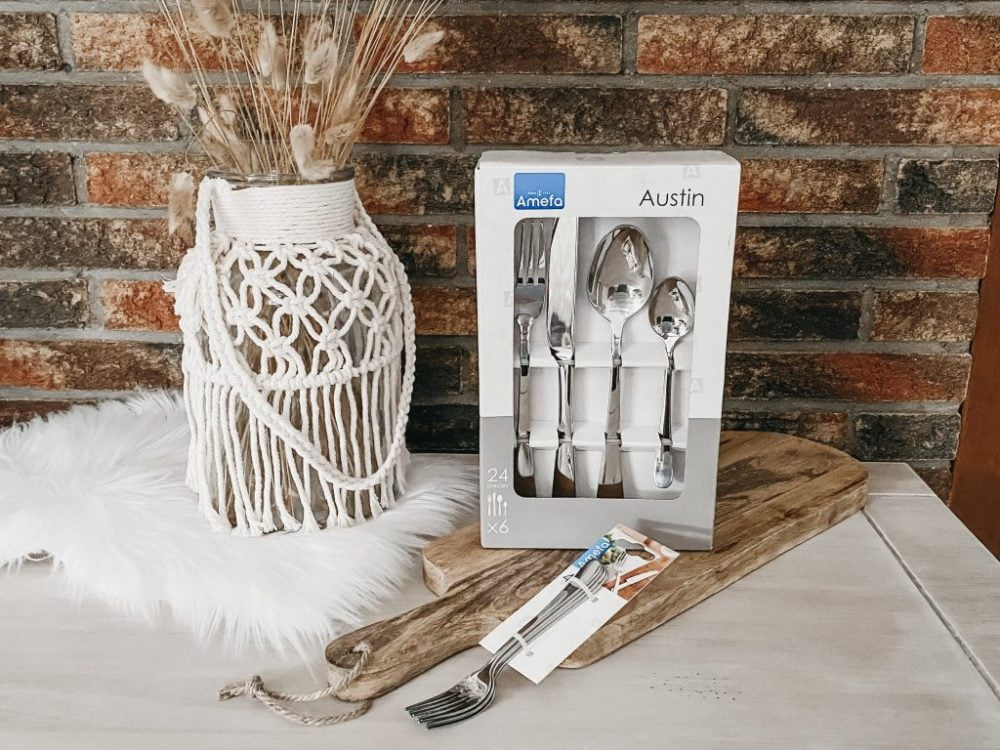 Omdat het servies wat mij betreft al echt prachtig is en de show steelt op tafel vond ik het goed om het bestek neutraal te houden. Al moet ik eerlijk toegeven dat het mat zwarte bestek en het zilveren bestek met leuke prints ook wel mijn aandacht trok. Toch heb ik gekozen voor eenvoudig, zilver bestek. Omdat dit in mijn ogen het allermooist staat bij het grijze Toscane servies. Ik heb gekozen voor de 24-delige Amefa Austin bestekset en de Amefa Austin gebaksvorkjes.