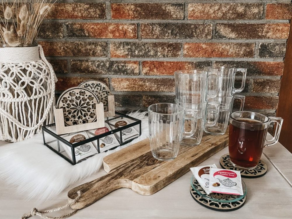 Als er iemand dol is op thee dan ben ik dat wel. Als ik uit huis ga kan ik dan ook niet zonder theeglazen, theedoos en theezakjeshouder. De theedoos is van glas en afgewerkt met zwart metaal. Super stoer en lekker tijdloos! Daarnaast past deze theedoos perfect bij het industriële keukengerei en de andere zwarte details die ik terug wil laten komen in huis. De theezakjeshouder is van glas en geeft mij een beetje dezelfde vibes als de theeglazen. Hij past er echt perfect bij. Over bijpassend gesproken… Wat vinden jullie van de sfeervolle houten onderzetters? Ook die zijn helemaal mijn ding. Ik wil sowieso houtelementen terug laten komen in mijn interieur omdat ik vind dat dit warmte en gezelligheid uitstraalt. Helemaal happy!