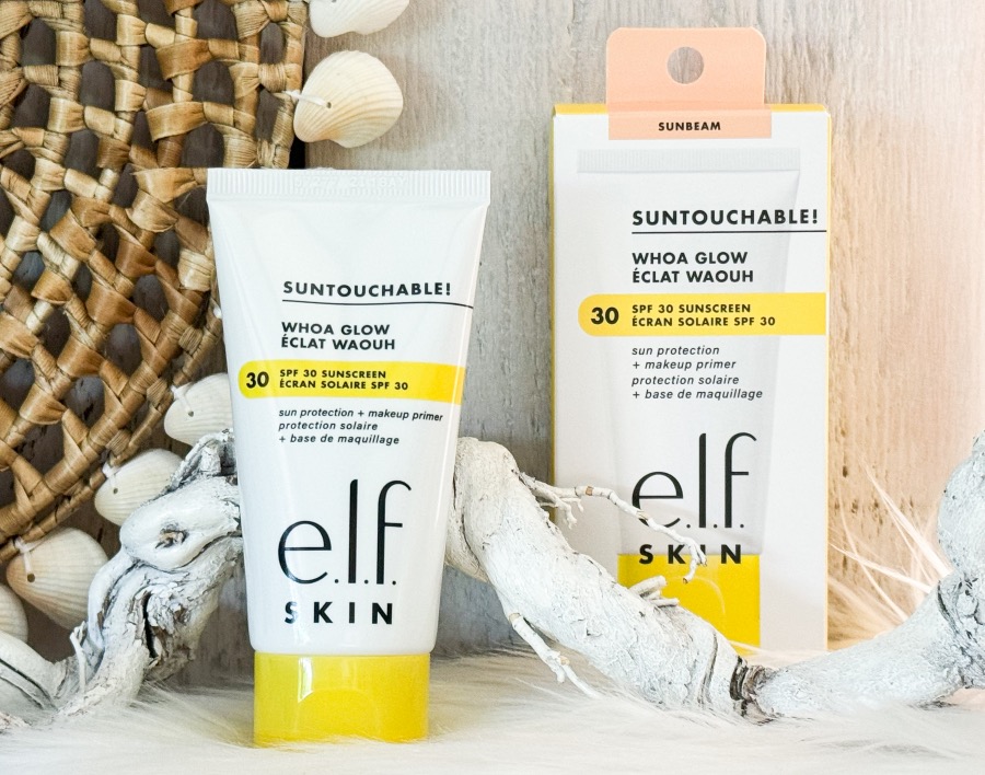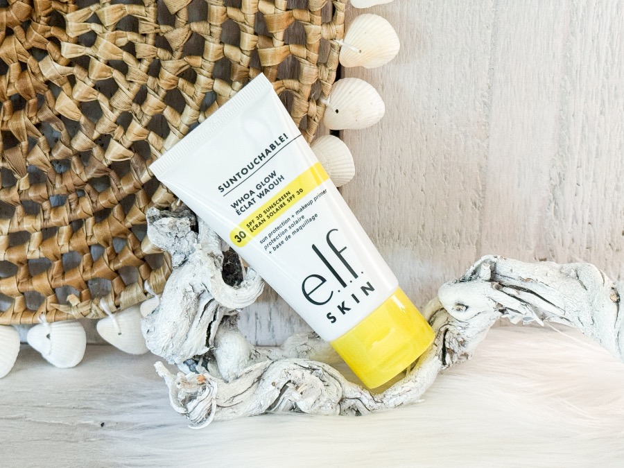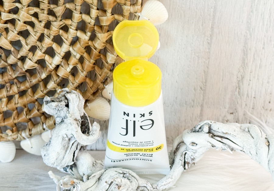 ‘Deze topper van e.l.f. is een lichte, breedspectrum SPF 30 zonnebrandcrème die ook dienst doet als make-up primer en de huid laat stralen.’