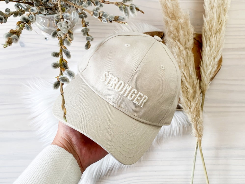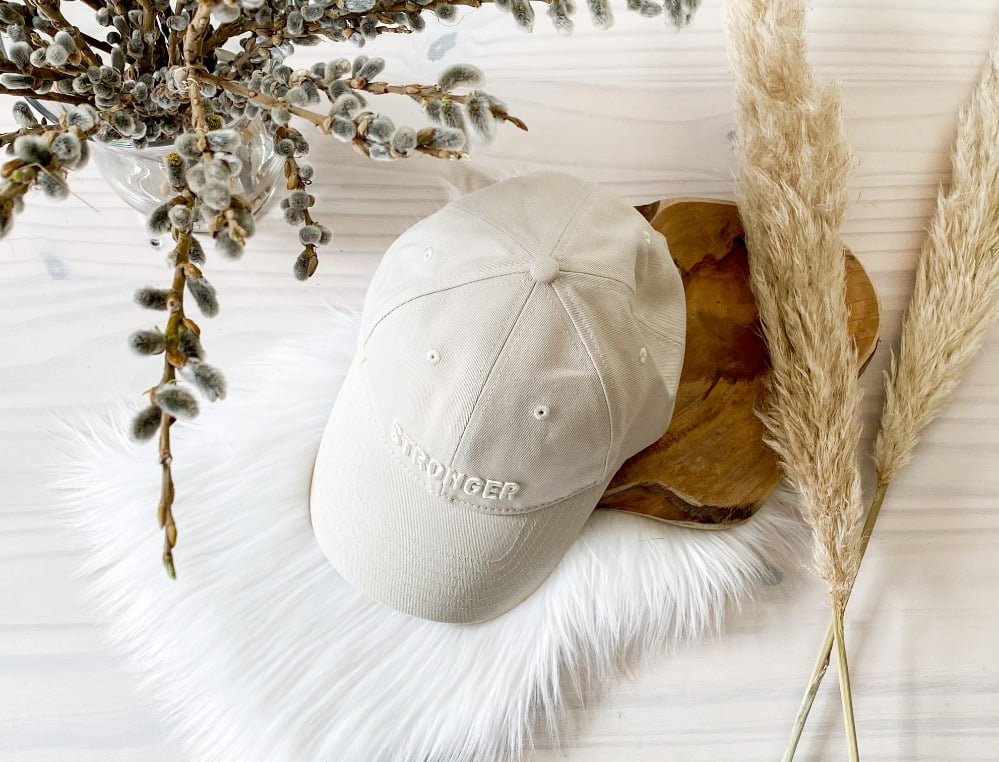 ‘Deze pet heeft een verstelbare pasvorm en ventilatiegaten voor een beter ademend vermogen.  Het heeft een geborduurd Stronger-logo op de voorkant en is het perfecte accessoire voor elke look.’