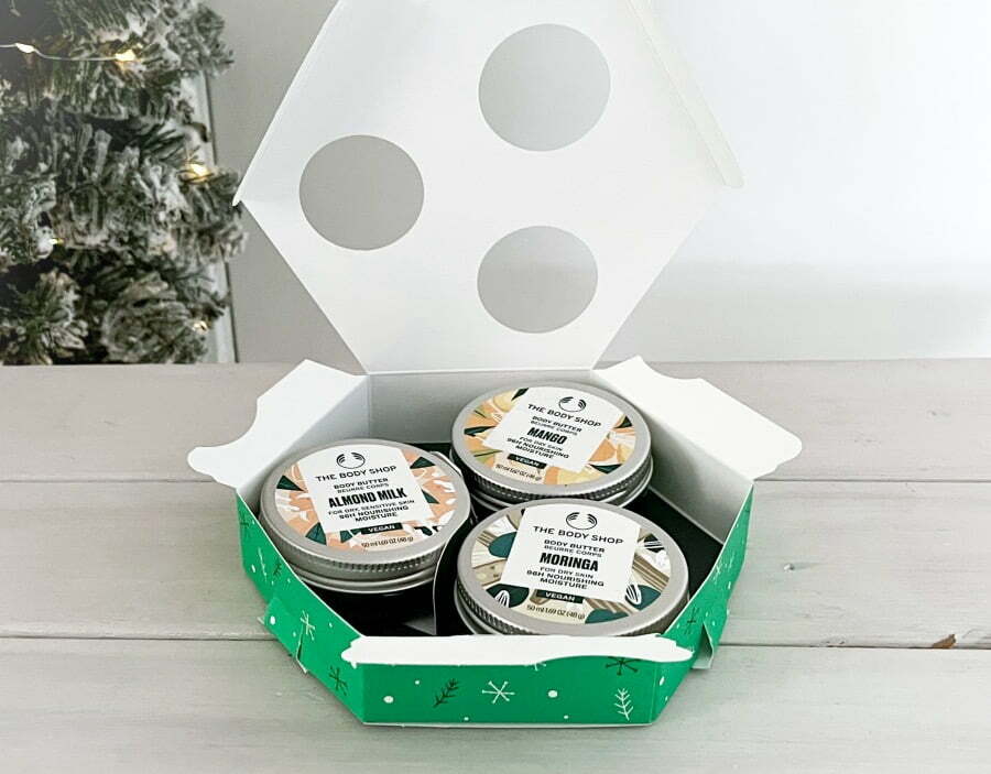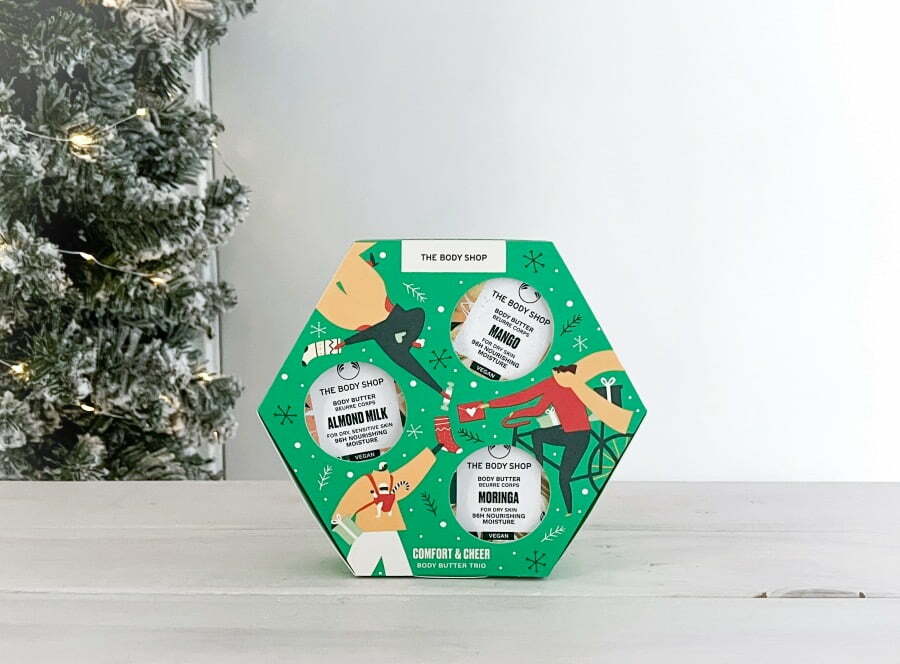De Comfort & Cheer Body Butter Trio bevat de 3 populairste Body Butter mini’s. Wat een verwennerij! De butters zijn 100% vegan en bestaan (minimaal) voor 95% uit ingrediënten van natuurlijke oorsprong, zoals Community Fair Trade-sheaboter die met de hand is bereid en die geweldige hydraterende, verzachtende eigenschappen heeft. Ze werken tot wel 96 uur vochtregulerend. Hallo, zachte huid! Dit fijne body care cadeautje houdt de huid glad en soepel in de koude wintermaanden. Een musthave giftset om te geven maar ook zeker om te krijgen! Je scoort deze giftset voor € 15,00, online of in één van The Body Shop winkels.