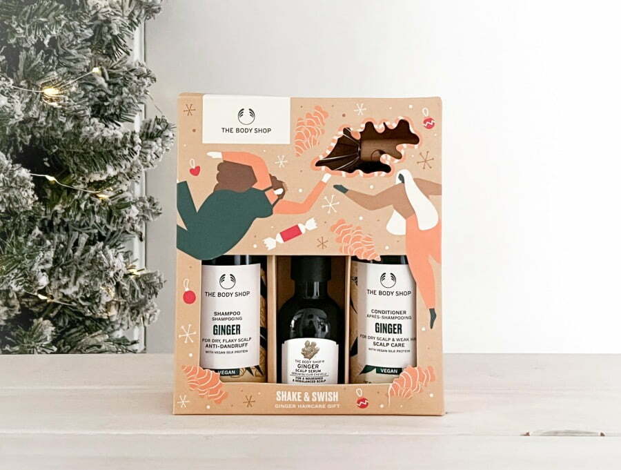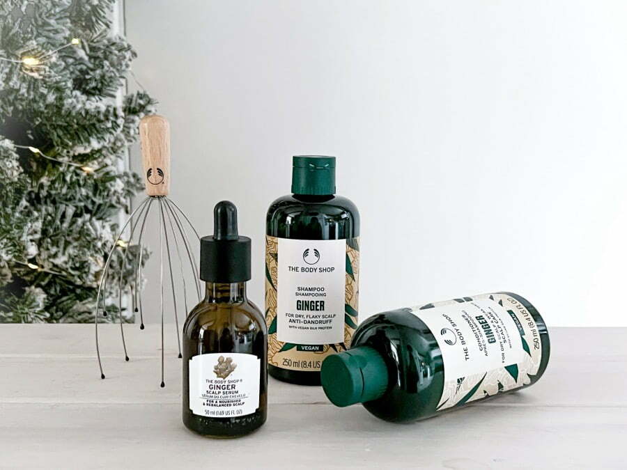 First of all: De beroemde Ginger shampoo & conditioner. Die bevatten nu vegan zijdeproteïne en bestaan (minimaal) voor 90% uit ingrediënten van natuurlijke oorsprong, zoals essentiële gemberolie, berkenschors- en schietwilgextract. Het duo rekent af met losse schilfers, helpt een droge hoofdhuid te verzachten en laat slap haar sterker, zachter en veerkrachtiger aanvoelen. Pak losse schilfers tussen wasbeurten aan met ons Ginger Scalp Serum. Je hebt er maar een paar druppels van nodig om je hoofdhuid minder trekkerig te laten aanvoelen. Deze lijn doet dus echt wonderen! Voor wat extra verwennerij zit er ook nog een Scalp Relaxer in deze giftset. Een geweldige tool waarmee je je hoofdhuid kunt masseren. Dit moet je echt een keer voelen! Deze giftset scoor je voor € 29,00, online of in één van The Body Shop winkels.