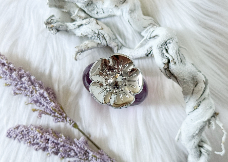 Ik ben verliefd! Het glazen flacon lijkt op een apothekersfles van vroeg en is voorzien van een ombre paarse kleur. Het flacon heeft een zilverkleurige spraycap in de vorm van de bekende Tea Rose. De leren ring onder aan de dop maakt het helemaal af. Zelfs het doosje waar het parfum in zit is prachtig. Deze is paars en volledig bedekt met glitters.