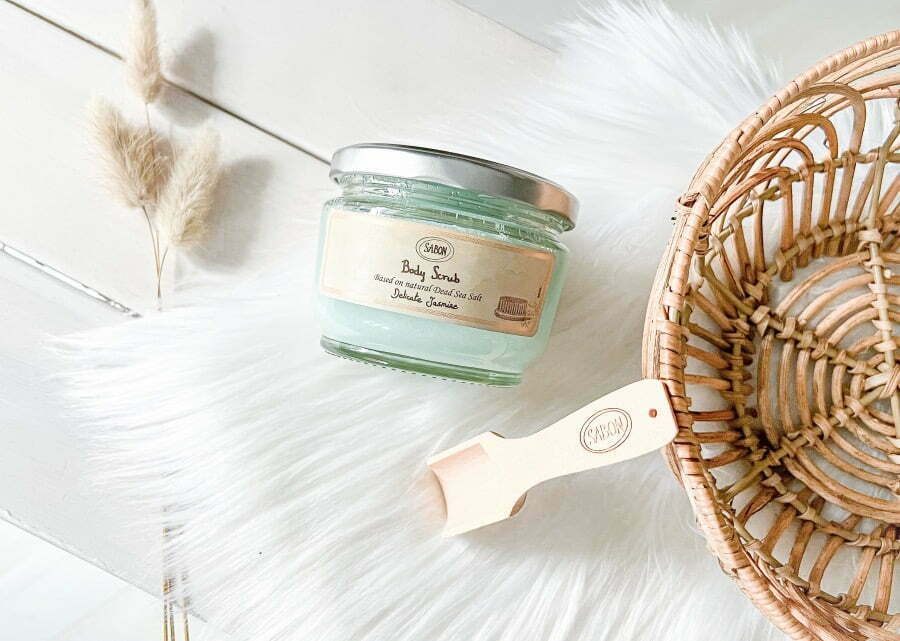 ‘Deze body scrub is geschikt voor de normale tot droge huid. Hij bevat zout uit de Dode Zee en is verrijkt met natuurlijke oliën. De zoutkorrels verwijderen op milde wijze dode huidcellen en helpen de huid zichzelf te vernieuwen. Na de peeling voelt de huid weer glad en zijdezacht aan. De geur “Delicate jasmijn“ is een bloemig-frisse geur van jasmijnbloemen.’