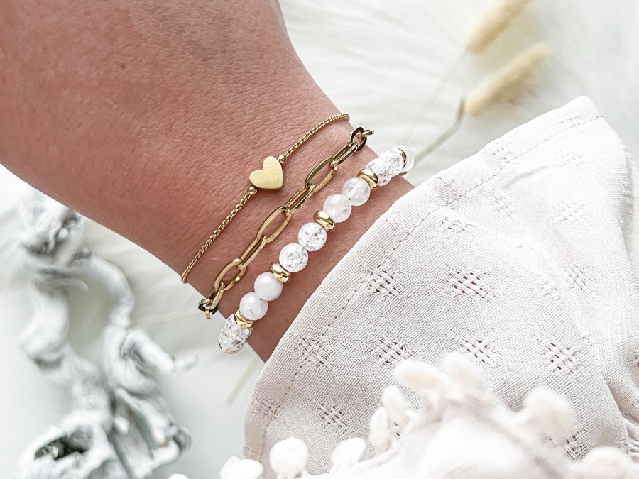 Deze armband heeft precies alles wat ik in een armband zoek een door de neutrale, witte kralen past dit armbandje letterlijk overal bij. Bijvoorbeeld bij mijn andere goudkleurige armbandjes maar ook bij iedere outfit. Ik ben écht helemaal in de wolken. Wat is ie mooi! Wat trouwens goed is om te weten is dat hij ook verkrijgbaar is met zilverkleurige tussenkraaltjes en sluiting. Hierdoor kunnen dus zowel zilver- als goudkleurige fans dit armbandje dragen.