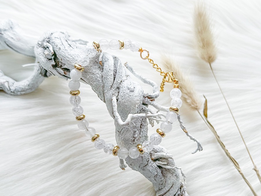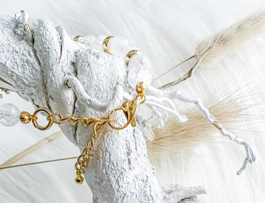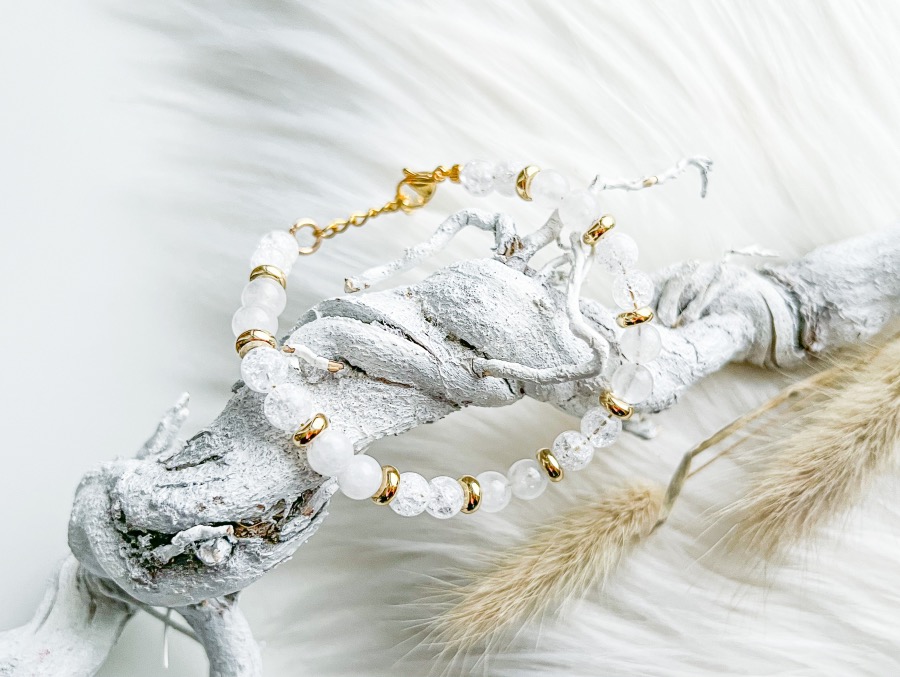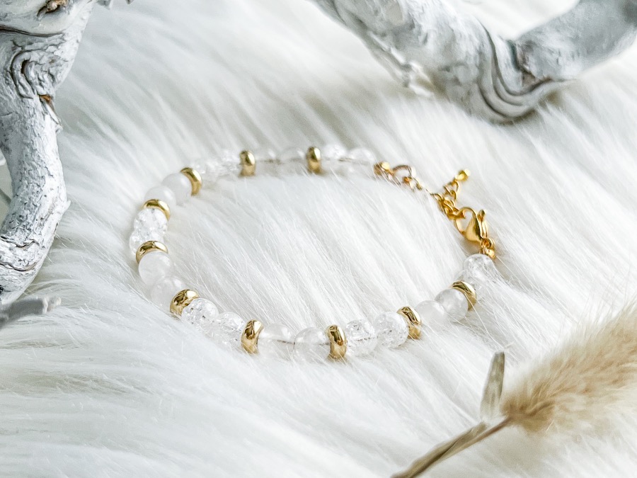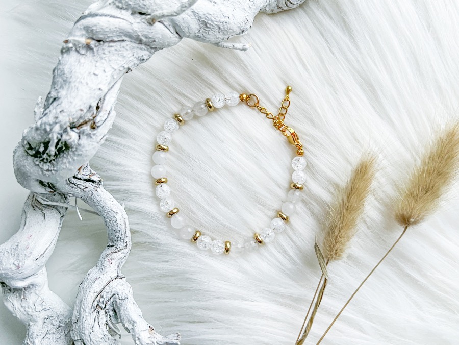 Armband Shannon (ik voel me zó speciaal nu) is écht een pareltje. De kralen van deze armband zijn 6 mm groot en zijn gemaakt van de natuurstenen bergkristal en witte Jade. Zijn ze niet prachtig? De armband die ik zelf nu draag heeft goudkleurige details zoals een goudkleurige sluiting en goudkleurige tussenkraaltjes. Zowel de kralen als sluiting zijn gemaakt van RVS (roestvrij staal) waardoor verkleuringen geminimaliseerd worden.