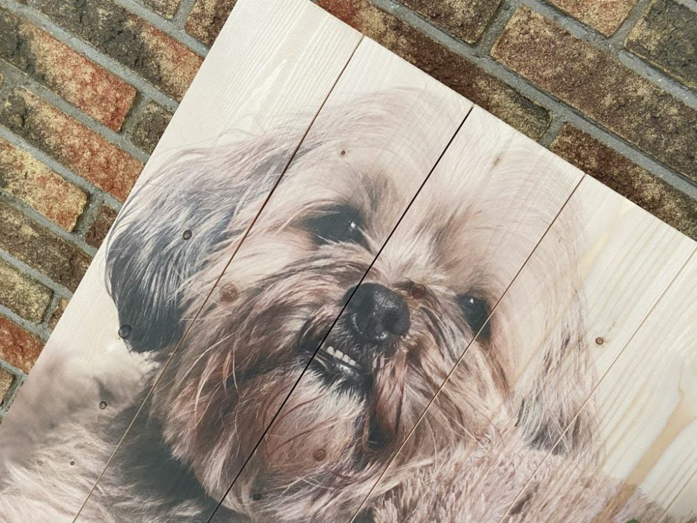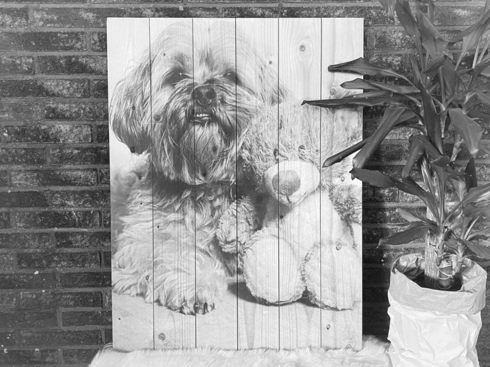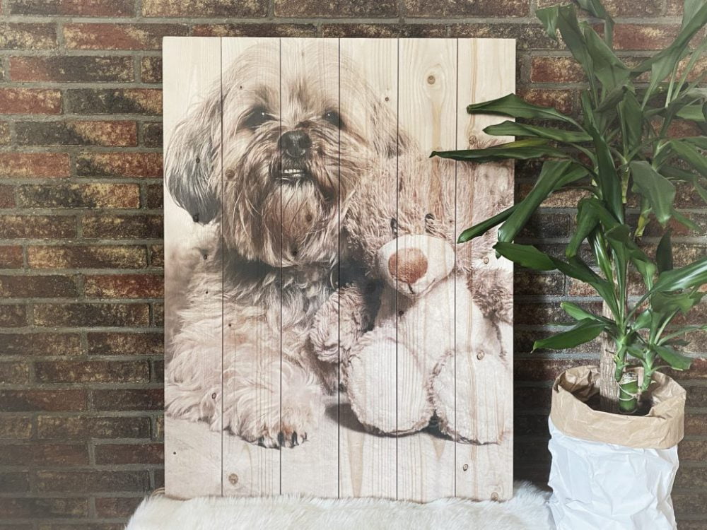 Een foto op steigerhout vind ik erg goed in onze woonkamer passen omdat wij veel houtelementen in onze woonkamer hebben. Daarnaast zijn de meest voorkomende kleuren in onze woonkamer beige, bruin en andere natuurlijke tinten waardoor een foto op steigerhout hier gewoon thuis hoort. Ik heb gekozen voor een recente foto van onze hond Dundy en hij is écht prachtig geworden. Ik heb niet gekozen voor de optie whitewash omdat ik het juist mooi vind als je de structuur van het hout door de foto heen ziet. De foto is echt boven verwachting scherp. Zelfs van dichtbij! Ik heb nog niet eerder zo’n mooi fotoproduct gezien als onze nieuwe foto op steigerhout. Wat ik ook echt een pluspunt vind is dat je er bevestigingsmateriaal bij krijgt.