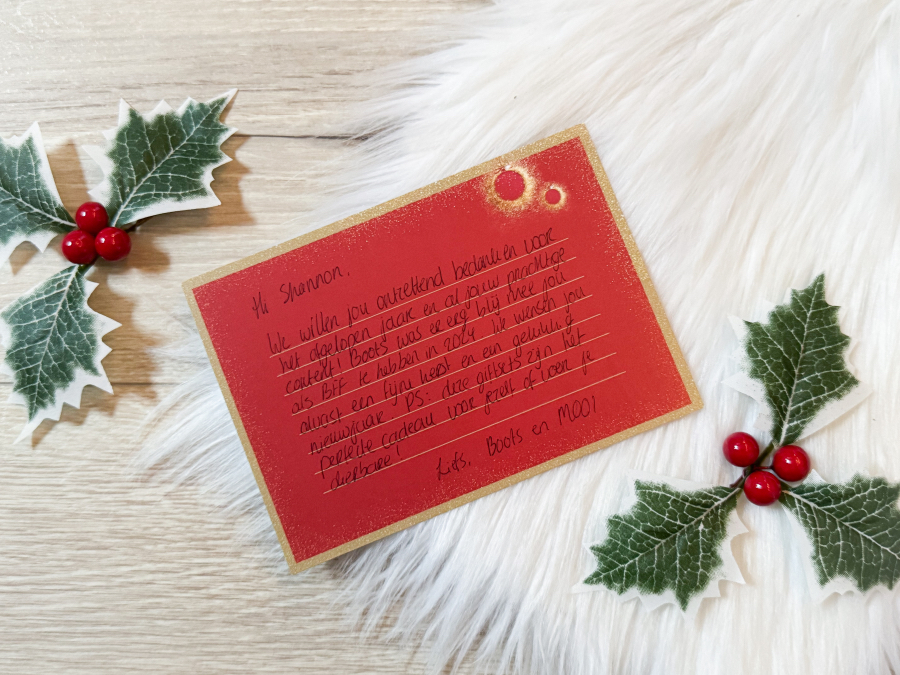 And last but not least nog dit hele lieve kerstkaartje. Boots & MOOI super bedankt voor het afgelopen jaar! Ik vond het weer een hele eer om met jullie samen te mogen werken. Ik was een trotse Boots BFF en heb met veel enthousiasme content voor jullie gemaakt. Wie weet spreken we elkaar snel weer!