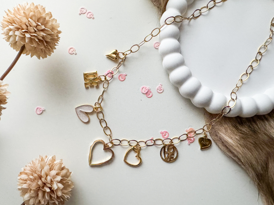 Ik ben verliefd! Dit bedelkettinkje heb ik volledig zelf samengesteld. Deze bedels zijn toch te leuk samen? Volledig in het thema liefde. Goed om te weten: Het kettinkje en de bedels zijn gemaakt van stainless steel en verkleuren dus niet. Om de ketting zo lang mogelijk mooi te houden is het wel raadzaam om de sieraden gewoon af te doen tijdens het douchen, zwemmen, slapen etc. Dit soort kettinkjes vind ik zelf prachtig om dragen op tops/truien met een hoge hals. Love it!