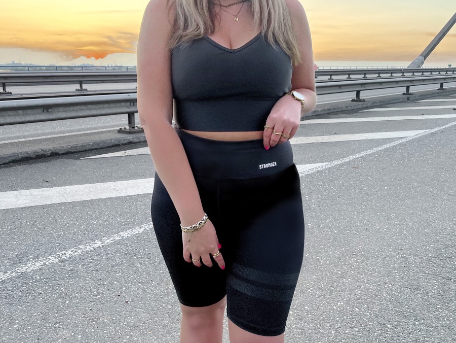 Dit keer heb ik een prachtig, zomers setje ontvangen die ideaal is voor de aankomende tijd. Namelijk een vrij basic zwarte biker short met daarbij een bijpassende sport bh uit precies dezelfde lijn. Nu is zwart niet echt een fleurige, vrolijke kleur maar past wel overal bij en is daardoor erg leuk om af te stylen met een wat feller vestje/jasje bijvoorbeeld. Ook kun je een zwarte sport bh of biker short altijd combineren met andere sport bh’s/tops of shorts/leggings. Vandaar dat ik voor zwart gekozen heb. Wat ik zo mooi vind aan dit setje is prachtige, glanzende stof. Dat maakt het net even wat minder basic evenals de welbekende, sportieve Stronger strepen op de biker short. I’m obsessed!