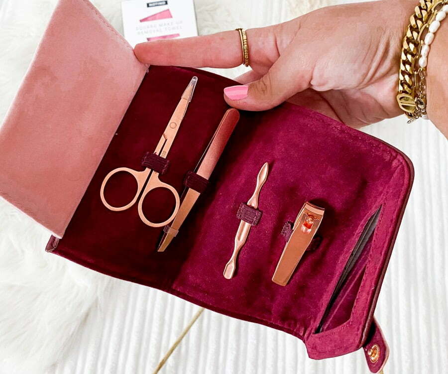 Om te beginnen deze hele leuke manicure kit. Dit is gewoon een ideaal setje om mee te nemen in je tas of op reis bijvoorbeeld. Zo heb je altijd alle musthaves bij de hand. De set bestaat uit een nagelknipper, een tool voor je nagelriemen, een pincet en een schaartje. Allemaal in een prachtige rosé gouden kleur. Hoe leuk is het etuitje ook waar alles in zit? Ik ben hier echt ENORM blij mee.