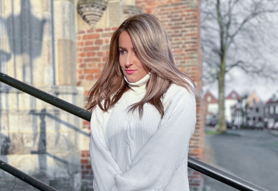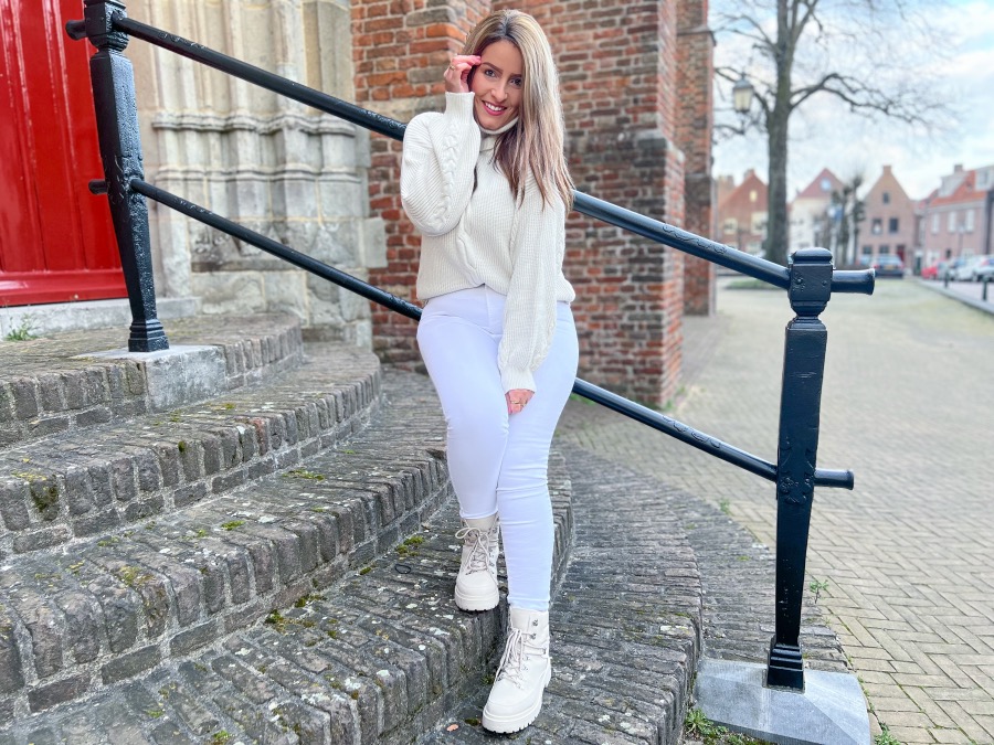 Oh my, kon ik jullie maar laten voelen hoe zacht en comfortabel deze trui is. Dit is echt zo heerlijk! Ik had nog geen trui in mijn kast die zo fijn is als deze. Het materiaal, de kwaliteit, de kleur en het model.. alles klopt aan deze trui. Volgens mij is dit ook echt de allerfijnste trui die ik ooit gehad heb! Hoe lekker is ook de heerlijke col? Van truien als deze moeten er echt meer gemaakt morgen. Naast alle pluspunten die ik al genoemd heb wil ik ook nog even benoemen dat ik ook het kabeldesign heel erg leuk vind. Dit maakt de trui in mijn ogen af. Dit is echt een pareltje! De trui combineerde ik met een witte jeans en wederom mijn favoriete schoenen die er echt perfect bij matchen. I’m so happy!