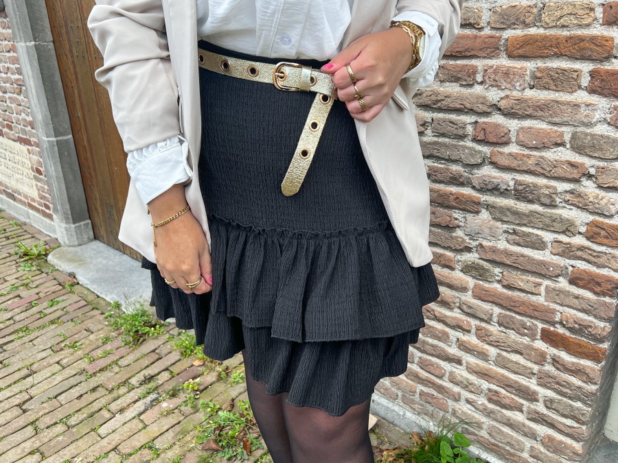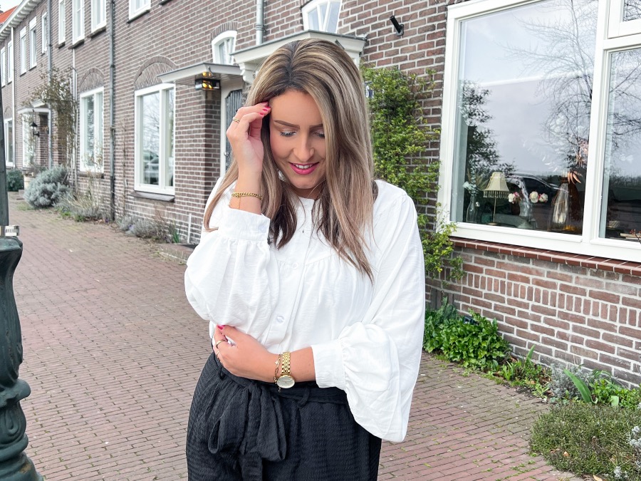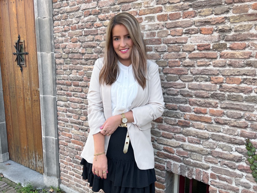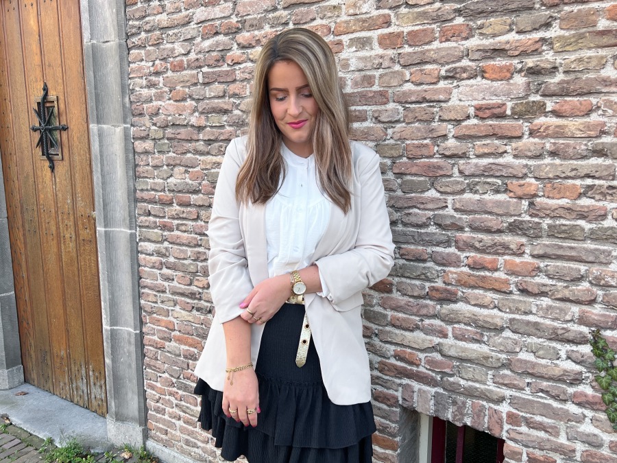 Mocht het nog niet zijn opgevallen, ik heb een zwak voor blazers. Volgens mij is deze beige blazer qua model bijna gelijk aan de zebraprint blazer. Ook deze blazer heeft aangerimpelde mouwen en naar mijn idee dezelfde fit. Ik vind hem zelf erg mooi vallen en daarnaast ben ik dol op de kleur beige. Helemaal mijn ding. Deze blazer combineerde ik wederom met de wijde, witte blouse met pofmouw. Dit is typisch zo’n blouse die je overal bij kunt combineren. Daar kun je er nooit genoeg van hebben. Tot slot droeg ik hier een zwart rokje bij waarvan het materiaal vergelijkbaar is met het materiaal van de short die ik droeg bij de eerste outfit. Het rokje heeft een elastische band, valt lekker zwierig en zit daardoor echt heerlijk. Daarnaast kun je zwart overal bij combineren. Een musthave voor iedere vrouw die dol is op het dragen van rokjes!
