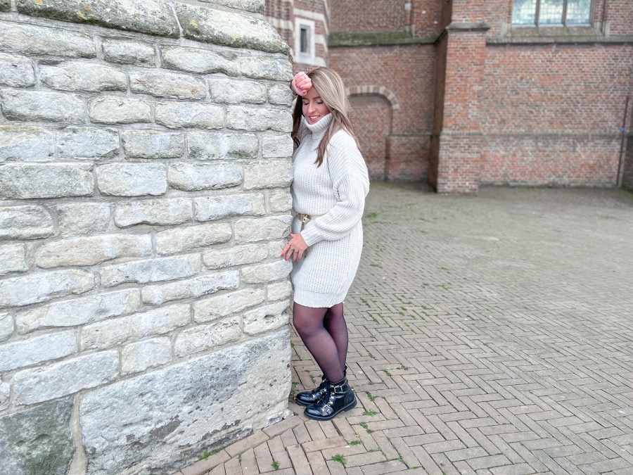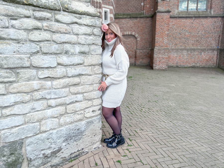 Voor deze outfit gebruikte ik maar één kledingstuk. Een lange, grofgebreide trui. Die ik zelf eerder zou omschrijven als jurk. Is ie niet prachtig? Met een kledingstuk als deze heb je binnen no-time een leuke outfit samengesteld. Je doet er een paar mooie boots onder, combineert hem met een leuk riempje en je bent klaar! Uiteraard kun je er nog meer accessoires aan toevoegen. Denk bijvoorbeeld aan je favoriete tas of muts. Ik droeg er met de huidige temperaturen lekker een panty onder en dit was helemaal prima. Stiekem vind ik dit ook wel mooier dan blote benen onder een gebreide jurk. Dit outfitje is niet alleen zo gemaakt hij zit ook nog eens mega comfortabel. Echt een musthave voor in je kast dus, zo’n gebreide jurk!