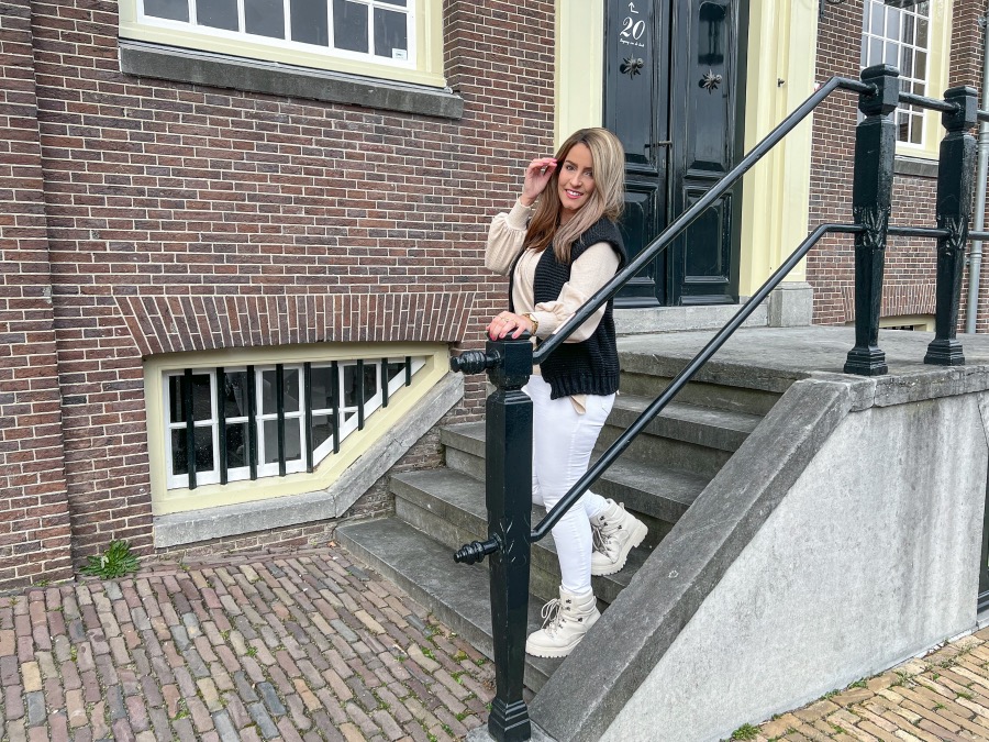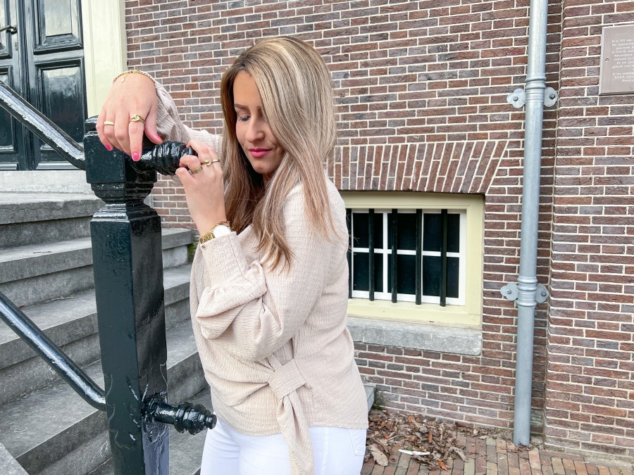 Bij deze outfit draait het allemaal om het gilet en de top. Afgelopen jaar en ook dit jaar weer zijn gilets helemaal mijn ding. Ik vind deze trend zo leuk en wat mij betreft mag hij dit voorjaar ook nog wel even blijven. Dit gebreide gilet is zo comfortabel en laat zich daarnaast ook weer erg makkelijk stylen. Je kunt hem letterlijk bijna overal overheen gooien. Dat is toch ideaal? Wat ik zo leuk vind aan dit gilet zijn de iets wat over de schouder hangende mouwtjes. Ik vind dat zo’n mooi detail! De overslag top wederom in een beige kleur is ook weer echt helemaal mijn ding. Het is een prachtige stof, het model valt erg leuk en daarnaast valt de overslag niet open omdat hij aan de bovenkant is vast gestikt. Heel fijn! Je kunt zelf bepalen hoe je de overslag wilt dragen door de strik aan de zijkant. Ook dit is weer zo’n leuk kledingstuk die ik zeer zeker zou aanraden. Ik ben verliefd op beide items! Ik combineerde op een witte jeans met daaronder mijn favoriete schoenen van dit moment. What do you think?