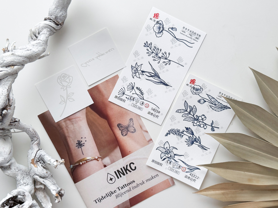 Wat ben ik blij met de ontdekking van Inkc.nl. Ik vind het erg leuk dat ik deze webshop via deze weg met jullie kan delen. Want het is echt heel erg leuk om te proberen. Ook handig voor als je een echte tattoo wilt. Zo kun je kijken of het wel bij je past en of je de plek waar je er een zou willen wel mooi vind. Maar het is ook leuk voor feestjes en festivals. Bestel één of meerdere bloemensetjes voor jou en je vriendinnen en jullie zijn ready to go! Op mijn Instagram zullen binnenkort wat tattoos op mijn huid te bewonderen zijn. Stay tuned!