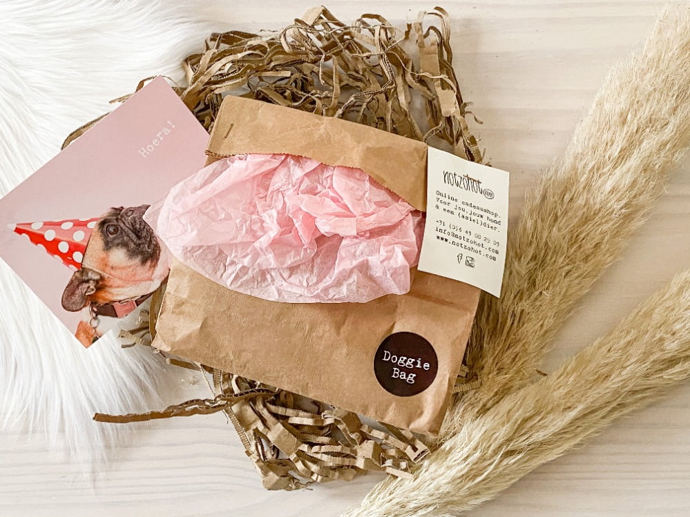 Ik heb voor Dundy een fantastisch samengestelde doggybag ontvangen vol leuke en lekkere producten. Ongeveer 95% van alle klanten kiest voor een reeds samengesteld (brievenbus)pakket. Deze zijn echt té gek! Maar omdat Dundy 13 jaar is geworden en ik met een aantal dingen rekening moet houden heb ik mijn wensen per mail doorgegeven. Notzohot heeft aan de hand van deze mail een pakketje samengesteld. Mega goede service! Uiteraard wil ik het beste voor Dundy!