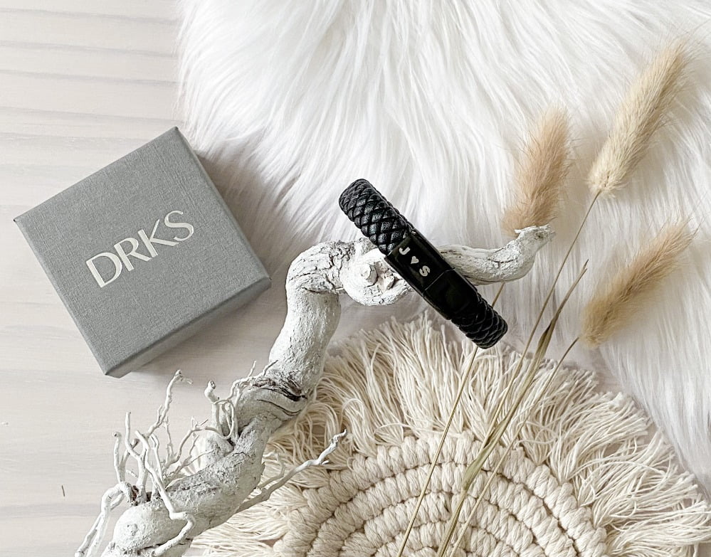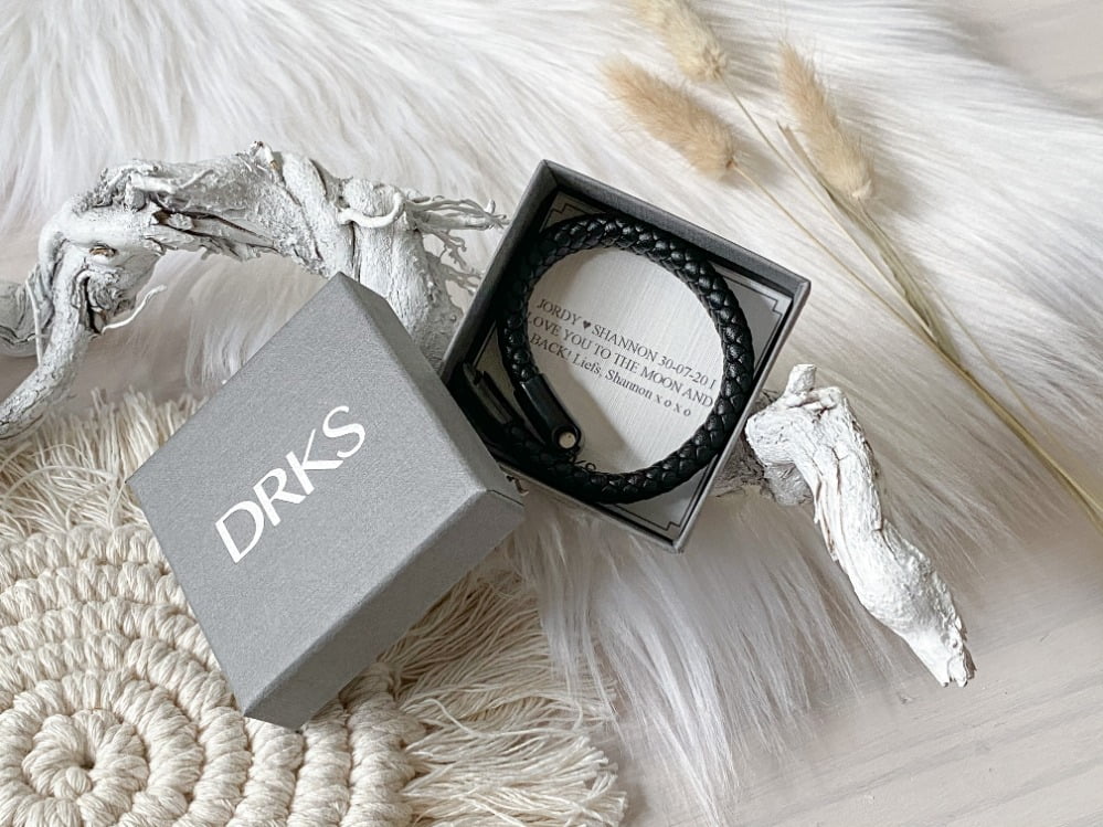 Het voordeel van deze zwarte leren armband is dat hij bij iedere outfit past. Zo kan hij altijd gedragen worden. De armband is stoer en stijlvol en perfect om de pols van je partner mee op te fleuren. Naast dat het sieraad mooi is, is ook het luxe sieradendoosje waar de armband in verpakt zit prachtig. Je kunt dit sieradendoosje zelfs laten voorzien van een persoonlijke tekst. Hoe bijzonder is dat? Wat ik echt een pluspunt vind is het gratis graveren. Dus geen extra kosten die er aan het eind nog bij komen! Ook de verzendkosten zijn gratis bij DRKS. Voordelen all over dus! Om het nóg leuker te maken heb ik ook nog een fijne kortingscode voor jullie waarmee jullie ook een mooi sieraad bij DRKS kunt scoren.