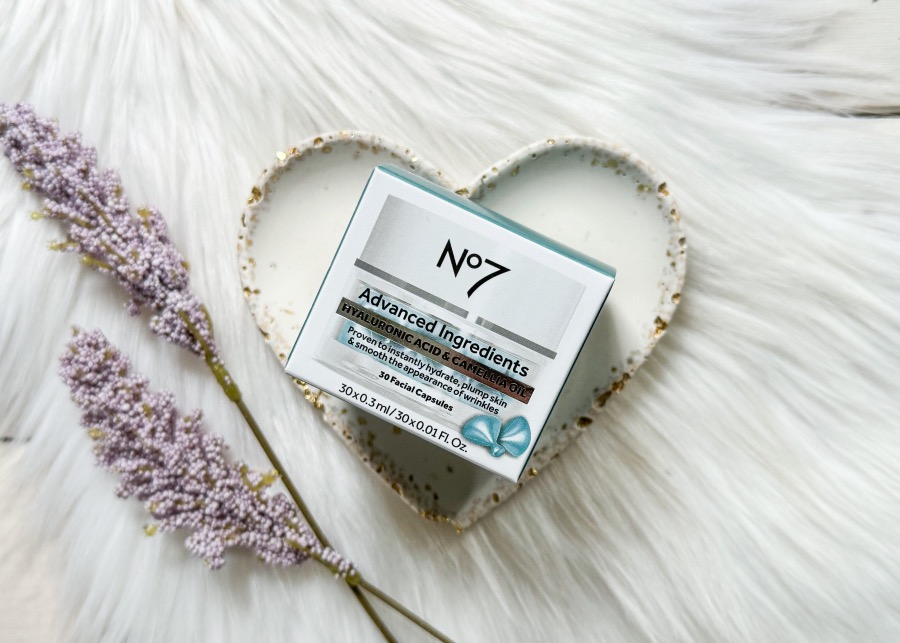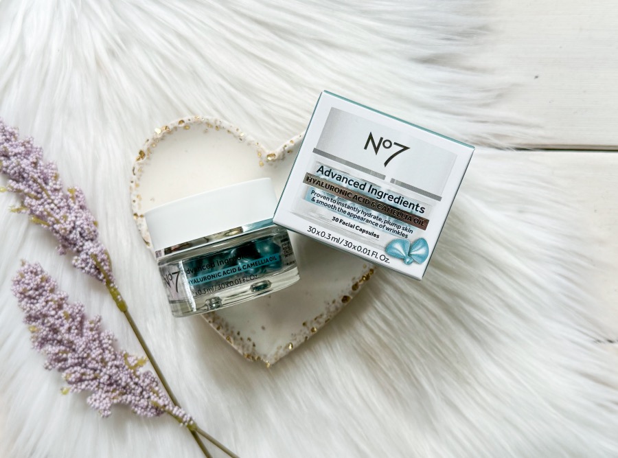 ‘De No7 Advanced Ingredients Hyaluronic Acid Facial Capsules zijn multi-moleculaire gezichtscapsules, verrijkt met hyaluronzuur en cameliaolie. de formule combineert verschillende molecuulgewichten van hyaluronzuur, in een zorgvuldige mix, wat vocht aantrekt en voor langdurige hydratatie zorgt. In de capsules werken de ingrediënten samen om wetenschappelijk bewezen resultaten op te leveren en de huid te vullen, zodat het er steviger en gladder uitziet en rimpels worden verzacht. 97% van de vrouwen had na gebruik van de capsules een gladdere huid. Na 4 weken ziet de huid er gelift uit.’
