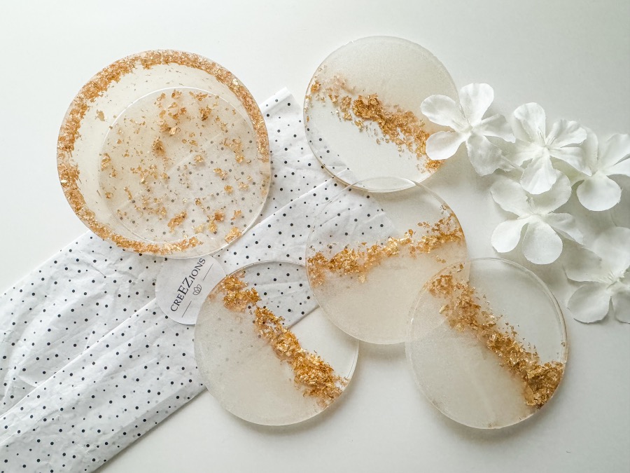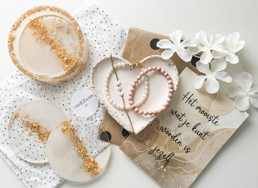 Wauw, ik vind epoxy zo’n mooi materiaal. Tegenwoordig doen ze er zoveel leuks mee. Bij CreEZions vind je ook veel leuke items gemaakt van epoxy bijvoorbeeld zeeppompjes, sleutelhangers, schaaltjes, sieraden en dus ook deze onderzetters. Deze onderzetters inclusief houder zijn gemaakt van transparante en witte epoxy en gemengd met bladgoud. Deze combinatie heb ik zelf zo doorgegeven dus ze zijn persoonlijk voor mij ontworpen. In de webshop vind je er nog meer! Onderzetters van epoxy zijn niet alleen heel erg mooi maar ook super fijn in onderhoud. Je kunt ze namelijk erg makkelijk schoonmaken en houden. Ik ben echt helemaal weg van deze. Die krijgen later een mooi plekje op tafel!