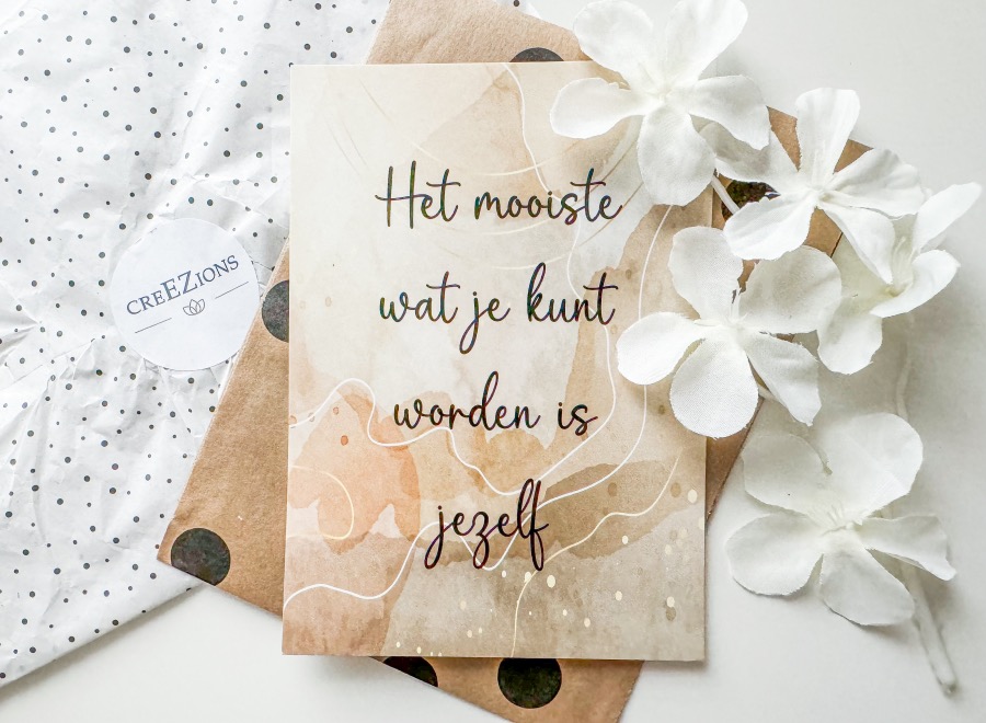 Hoe mooi is deze kaart? De tekst alleen al vind ik prachtig! De kleuren, het lettertype, alles klopt in mijn ogen. Ik ben sowieso iemand die heel graag kaartjes schrijft en geeft dus ik ben hier super blij mee. Op dit moment staat dit kaartje alleen als setje te koop. In dit setje krijg je een kaarthouder, droogbloemetjes en dit kaartje. Super leuk om cadeau te geven en nét een tikkeltje specialer dan het kaartje los. De prijs van deze set is € 17,99. Mocht je het kaartje ook los willen bestellen neem dan contact op met de eigenaresse van de webshop. Dit kan namelijk ook!