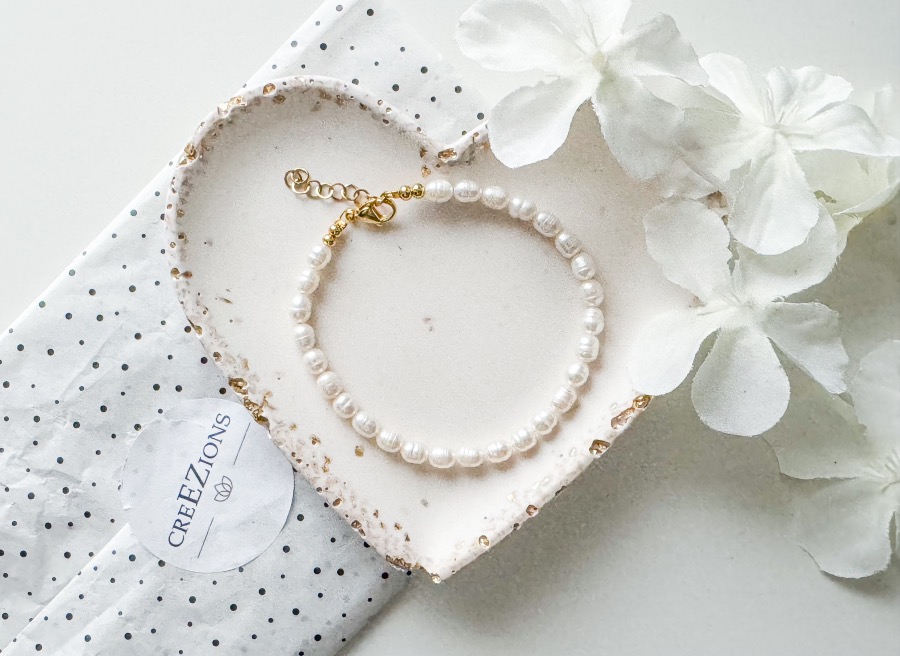 Oeh, ik hou van zoetwaterparels zeker in combinatie met goud. Ik vind armbandjes als deze erg leuk om te combineren met andere armbandjes. Daarnaast zijn ze erg neutraal waardoor ze ook bij iedere outfit leuk staan. Toevallig heb ik er eentje bij CreEZions gevonden die er ontzettend goed bij past.