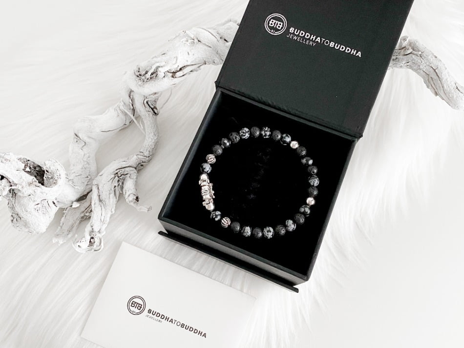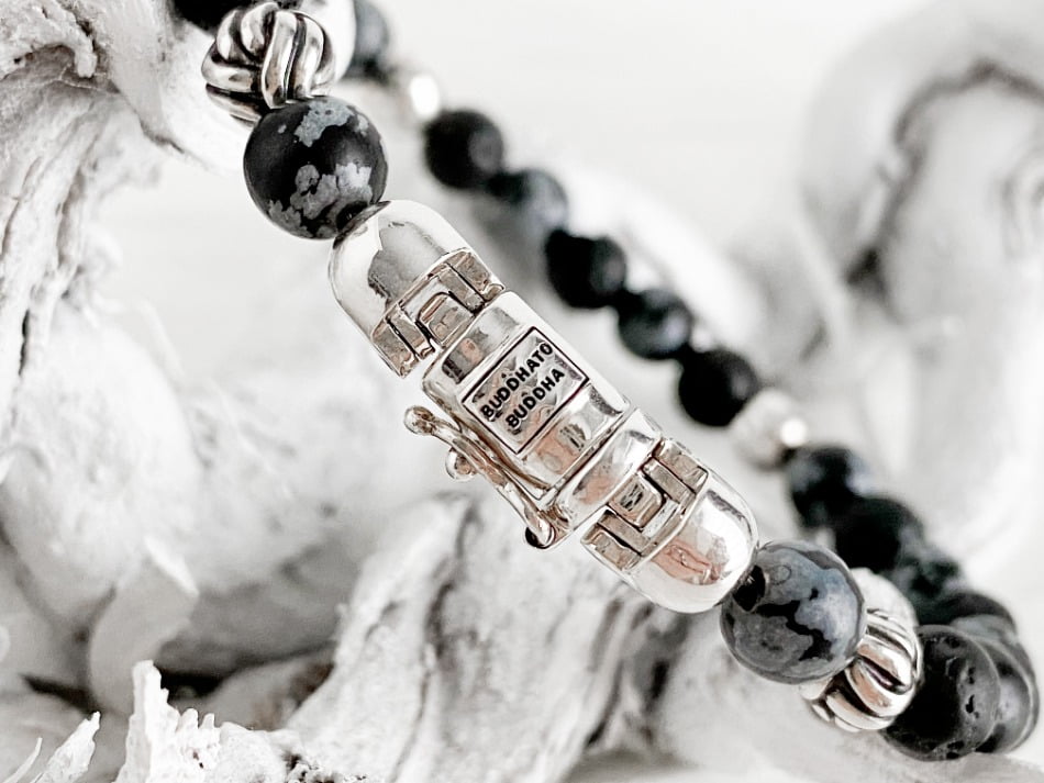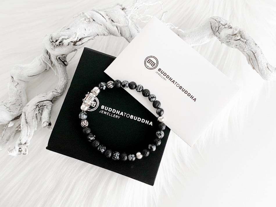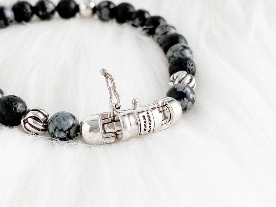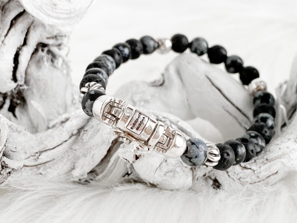 De stoere Spirit Bead Mini Snowflake armband van Buddha to Buddha komt uit de Spirit collectie. De armband is unisex en kan zowel door dames als heren gedragen worden. Ik heb zelf nog een andere Buddha to Buddha armband waar deze armband dus perfect bij matcht. De armband bestaat uit zwarte lavastenen afgewisseld met sneeuwvlok- obsidiaan stenen. Dit zijn echte edelstenen wat de armband voor mij een tikkeltje specialer maakt.