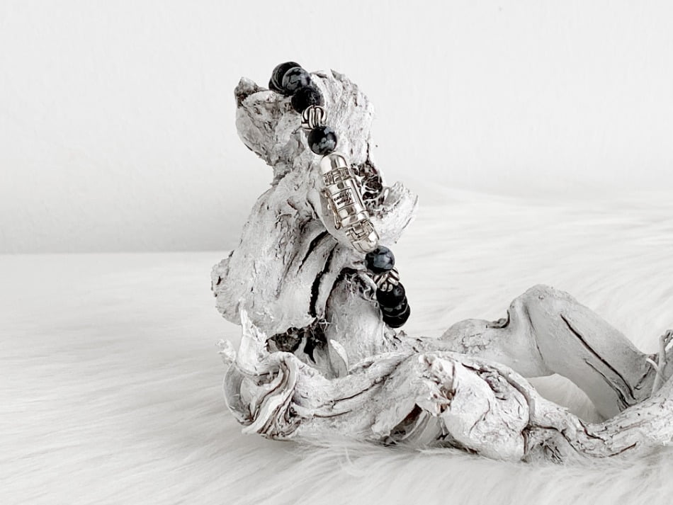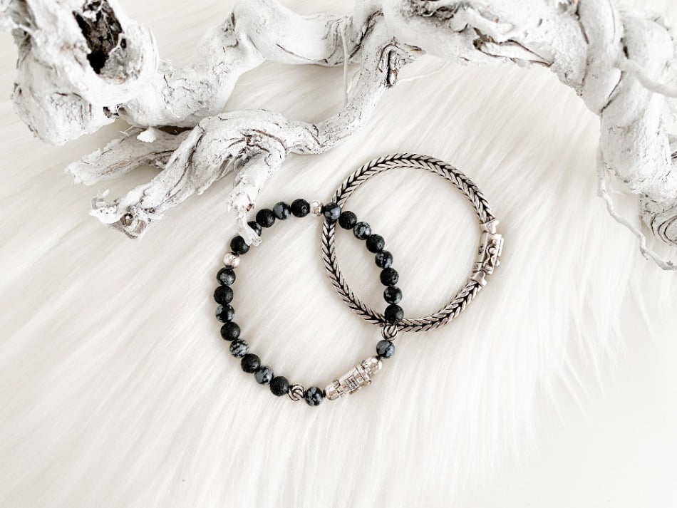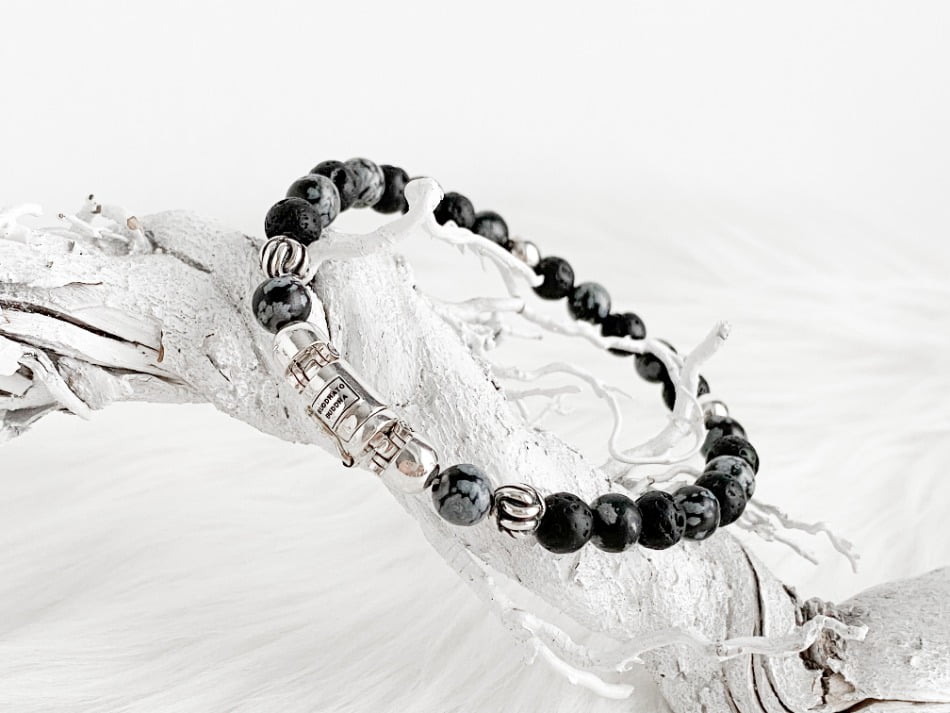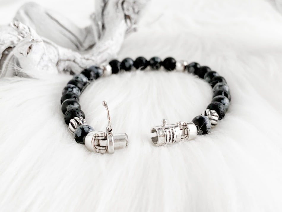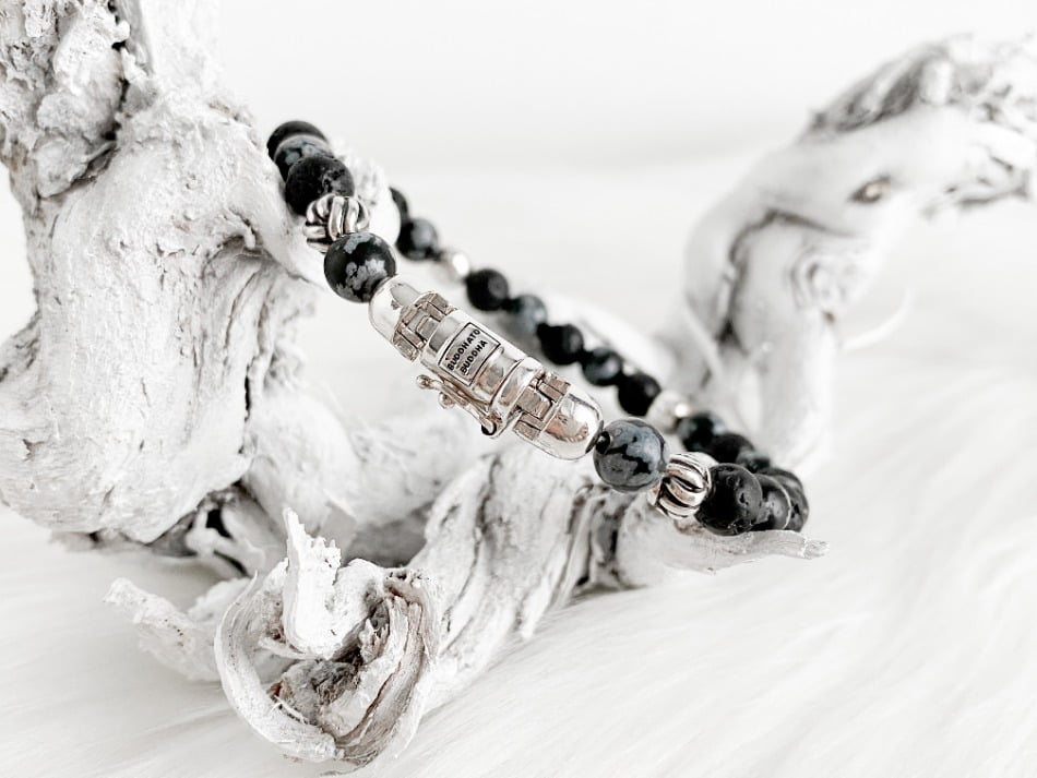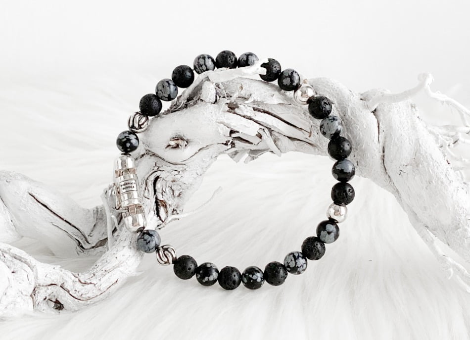 De stoere Spirit Bead Mini Snowflake armband van Buddha to Buddha komt uit de Spirit collectie. De armband is unisex en kan zowel door dames als heren gedragen worden. Ik heb zelf nog een andere Buddha to Buddha armband waar deze armband dus perfect bij matcht. De armband bestaat uit zwarte lavastenen afgewisseld met sneeuwvlok- obsidiaan stenen. Dit zijn echte edelstenen wat de armband voor mij een tikkeltje specialer maakt.