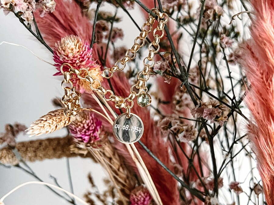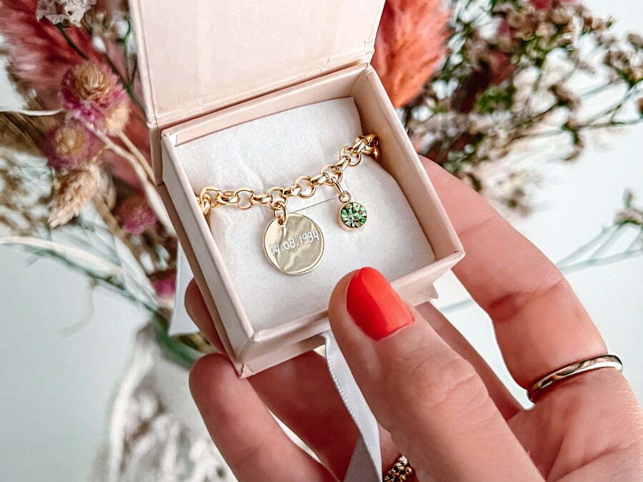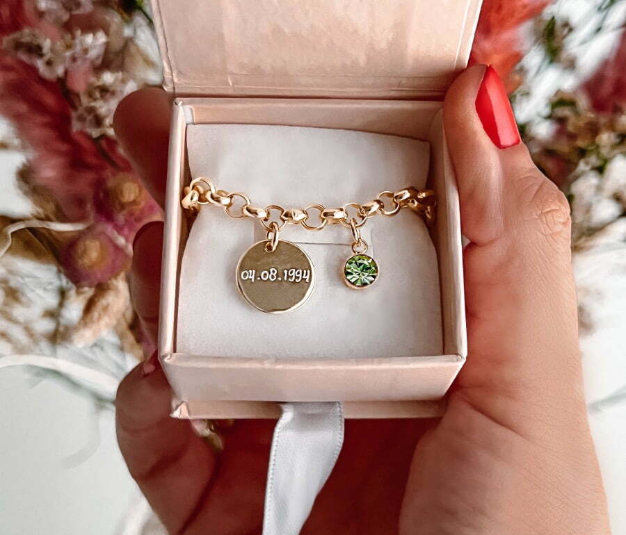 Zelf heb ik gekozen voor een prachtig armbandje in een vergulde gouden kleur. Het armbandje is voorzien van een ronde bedel met daarin mijn geboortedatum gegraveerd. Daarnaast hangt er ook een Swarovski® geboortesteentje aan de armband. Ik heb uiteraard voor mijn geboortemaand augustus gekozen en daarbij hoort een Peridoot. Ik vind hem echt prachtig geworden.