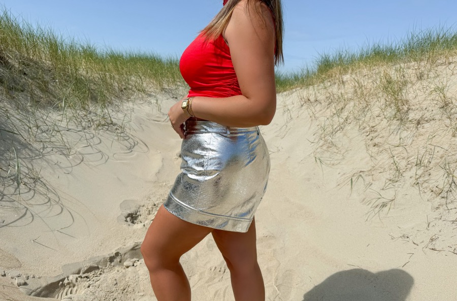 ‘Deze short heeft een rits- en haaksluiting, een hoge taille en een metallic stof.’