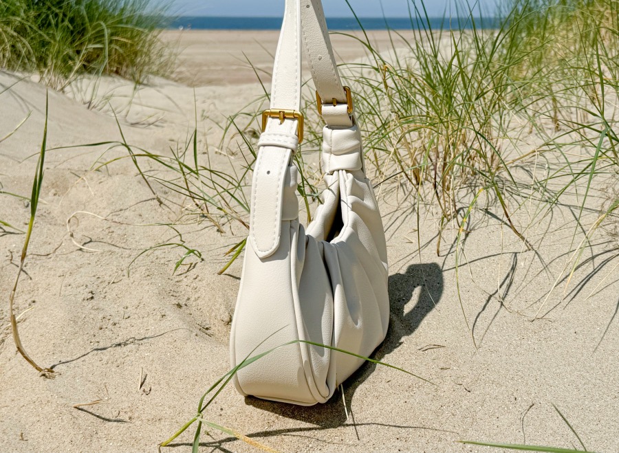 ‘Deze handtas heeft een PU leren stof met plooien, een goudkleurige drukknoopsluiting en twee verstelbare hengsels.’