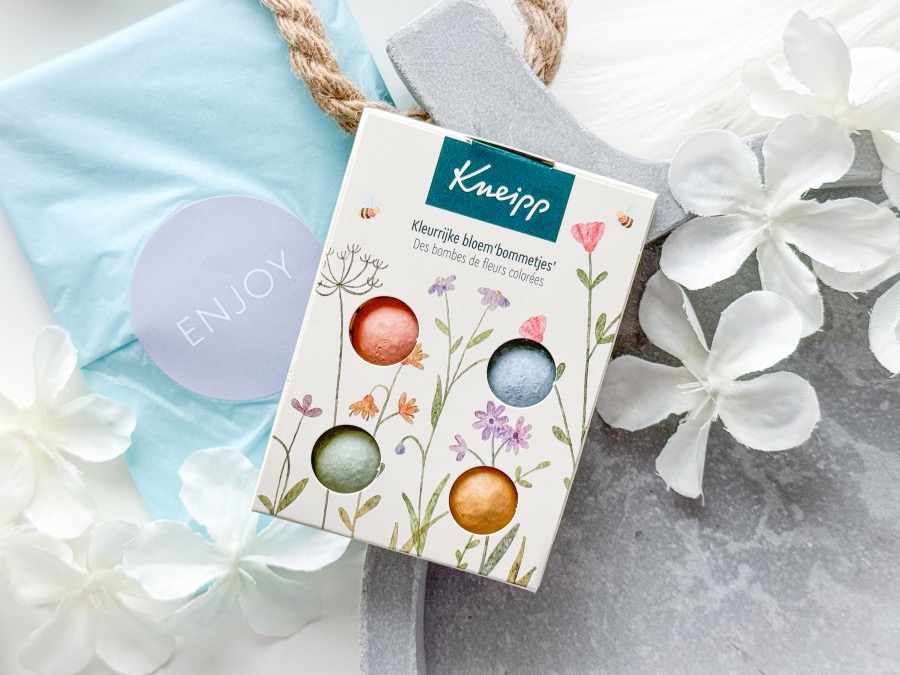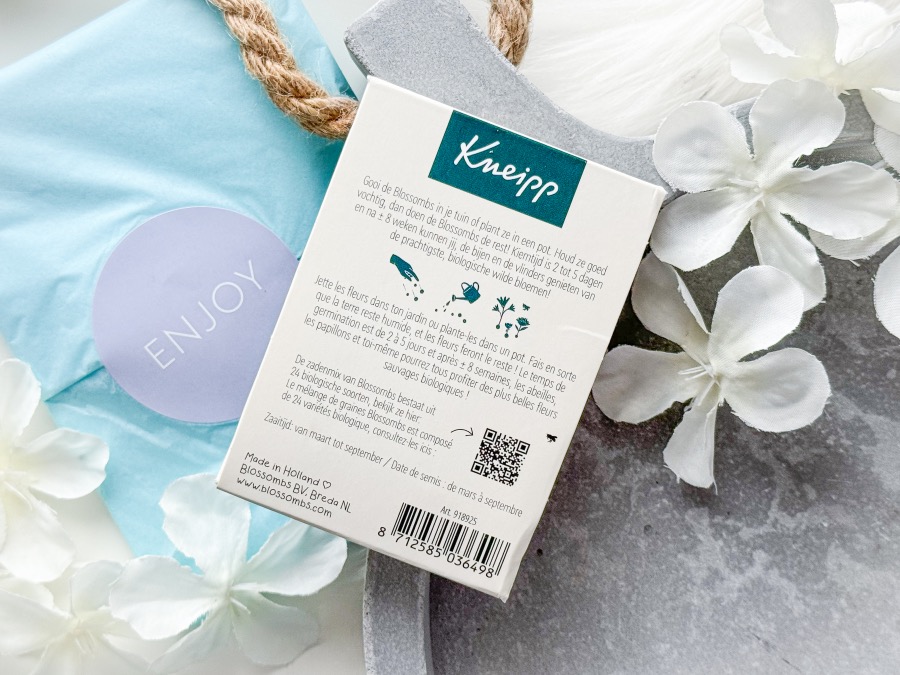 In het perspakket zaten niet alleen de twee heerlijke nieuwe douchegels. Er zat namelijk ook een andere leuke verrassing bij. Een doosje met daar in 4 gekleurde bolletjes (ook wel Blossombs genoemd) waarmee je de mooiste biologische bloemen krijgt waar bijen en vlinders dol op zijn.
