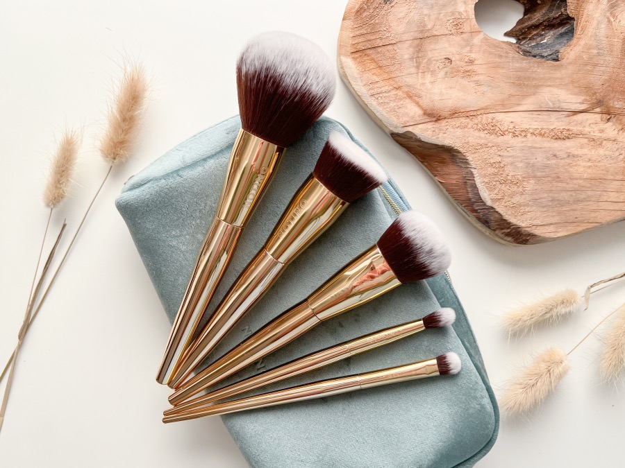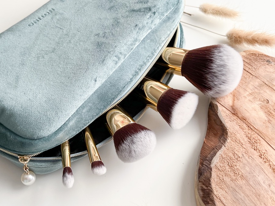 LAST BUT NOT LEAST! Deze ge-wel-di-ge make-up kwasten set. Wauw! De set bestaat uit 5 prachtige penselen met gouden handvat. Ze komen in dit geweldige, velvet groene make-up tasje met een pareltje aan de ritssluiting als finishing touch. Groen en goud vind ik sowieso al een geweldige combinatie maar als de make-up kwasten er dan ook nog zó goed uit zien en veelzijdig zijn.. ja dan heb je me! Met veelzijdig bedoel ik dat er in deze set van 5 veel variatie zit aan kwasten. Er zit een ronde en platte oogschaduwkwast in, een foundationkwast, een kwast voor bronzer, highlighter of blush en nog een poederkwast. I love it! Het make-up tasje heeft daarnaast ook een fijn formaatje (23 x 15 cm) waardoor je al je beauty musthaves op een stijlvolle manier op kunt bergen en kunt vervoeren.