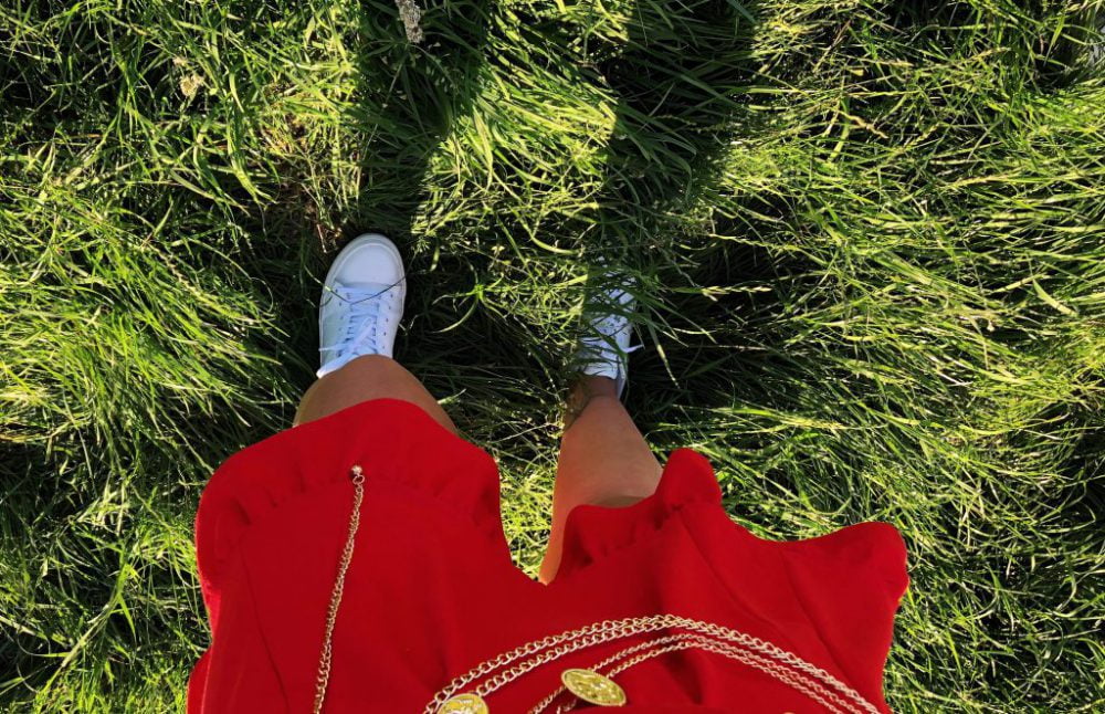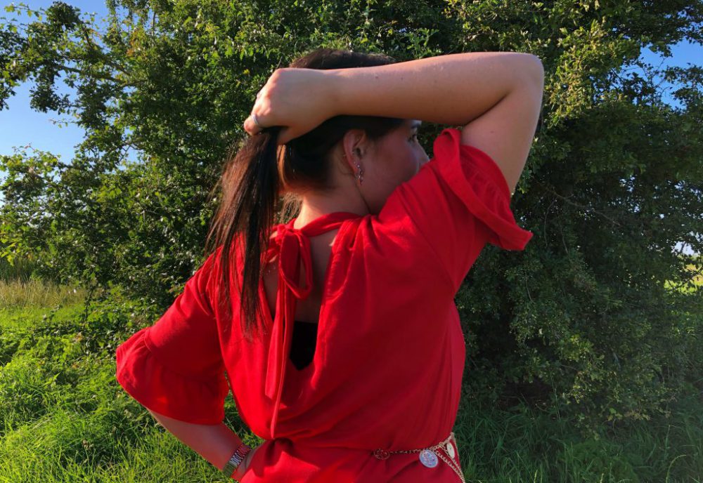 Het jurkje is knalrood en lekker opvallend. I love it! ik ben dol op dit soort roodtinten. Het model van het jurkje is recht en een tikkeltje oversized. Ik heb het jurkje zelf afgemaakt met een goudkleurige muntjes riem. Dit accessoire past er erg goed bij vind ik! Wat ik een ontzettend leuk detail vind aan dit jurkje zijn de roesjes. Dit maakt het jurkje lief maar geeft hem ook een speelse twist. Een ander detail die ik ook zeker even moet benoemen is de open V rug met strikdetail. Super leuk! Details zijn vaak de kers op de taart.