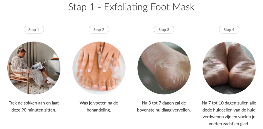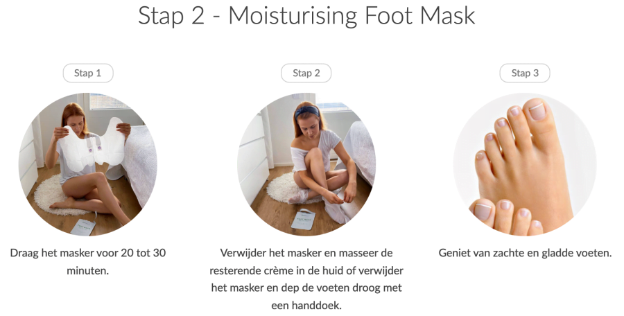 De Softening Foot Kit bestaat uit twee producten. Het Exfoliating Foot Mask en het Moisturising Foot Mask. Je gebruikt als eerst het Exfoliating Foot Mask. Na een aantal dagen gaan je voeten vervellen en laat de bovenste huidlaag los. Dit is oprecht een hele bijzondere ervaring! Na 7 tot 10 dagen zullen alle dode huidcellen van de huid verdwenen zijn en voelen je voeten zacht en glad. Na ongeveer 10 dagen kun je dan het Moisturising Foot Mask gebruiken. Dat is echt de kers op de taart in de Softening Foot Kit.