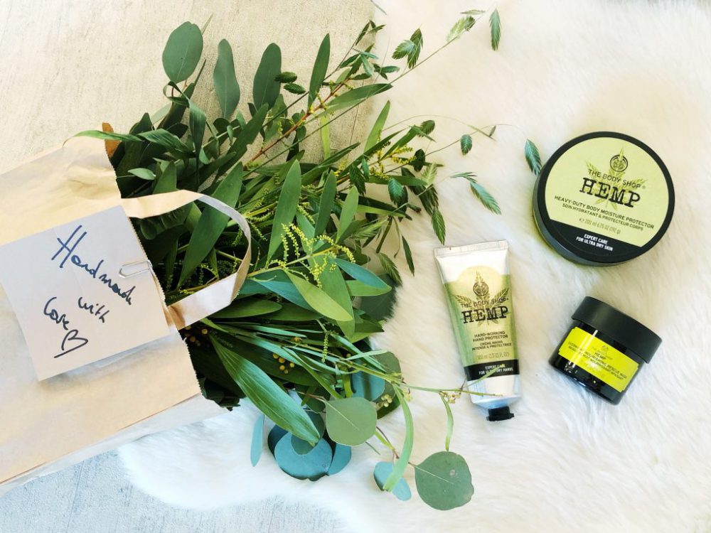 Deze week heb ik echt een hele leuke verrassing gekregen. Een mooi groen boeket, verpakt in een papieren tasje. Hoe lief! Ik had geen idee van wie deze verrassing kon zijn maar toen ik het boeketje uit de tas haalde zag ik 3 heerlijke producten uit de Hemp lijn van The Body Shop.