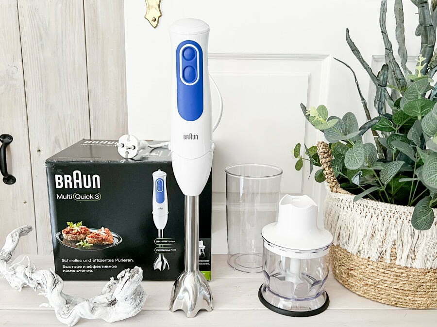 Oh dit is weer zo’n enorm leuke en vooral praktische toevoeging aan de BlogBox. Ook deze staafmixer van Braun mocht ik van mijn moeder hebben voor mijn uitzet. We kunnen dus wel de conclusie trekken dat mijn moeder de allerliefste is. Deze had ik nog niet voor mijn uitzet en komt dus heel erg goed van pas. Hij is heel eenvoudig in gebruik heb ik al gezien en er zit een hakmolen bij met een inhoud van 350 ml en zelfs een maatbeker. Vooral de hakmolen is een hele fijne toevoeging vind ik zelf. Je kunt hem makkelijk aan de staafmixer bevestigen en daarnaast is hij ook makkelijk schoon te maken. IDEAAL! De staafmixer is voorzien van de PowerBell Plus technologie en een kelkvormige voet met extra snijmesje die ervoor zorgt dat het eten nog sneller en makkelijker gepureerd wordt. De SplashControl technologie zorgt ervoor dat de keuken en ik zelf spat vrij blijven. Kliederen en knoeien is dus verleden tijd met deze topper!