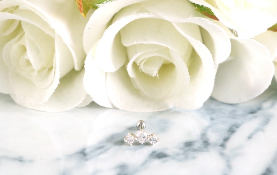 Deze helix piercing vind ik net als de vorige piercing erg mooi. Doordat deze piercing 3 strass steentjes heeft is hij vrij opvallend. Deze piercing is gemaakt van chirurgisch staal en de top van de piercing is gemaakt van 925 zilver. De piercing is 1,2 mm breed en 6 mm lang. Het balletje van de piercing is 3 mm breed en de totale breedte van de strass steentjes is 10 mm. Deze breedte vind ik precies goed. De piercing had voor mij niet groter hoeven zijn. Perfect!